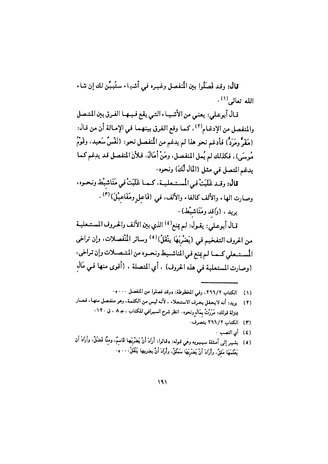 قال أبو علي: يعني من الأشياء التي يقع فيها الفرق بين المتصل والمنفصل من الإدغام، كما وقع الفرق بينهما في الإمالة أن من قال: (مَفَرٌّ ومَرَدٌّ) فأدغم نحو هذا لم يدغم من المنفصل نحو: (نَفْسُ سعيد، وقومُ موسى)، فكذلك لم يُمل المنفصل، ومَنْ أمال، فلأن المنفصل قد يدغم كما يدغم المتصل في مثل (المال لَّك) ونحوه.