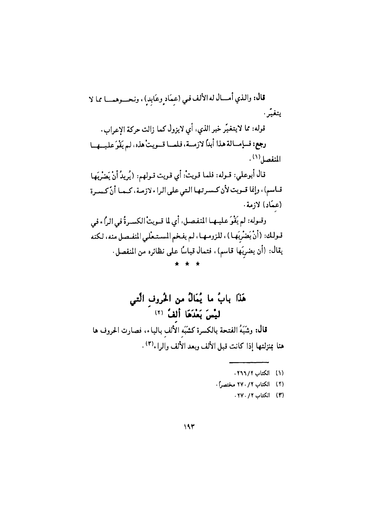 قال: والذي أمال له الألف في (عِمادٍ وعابِدٍ)، ونحوهما مما لا يتغيّر.