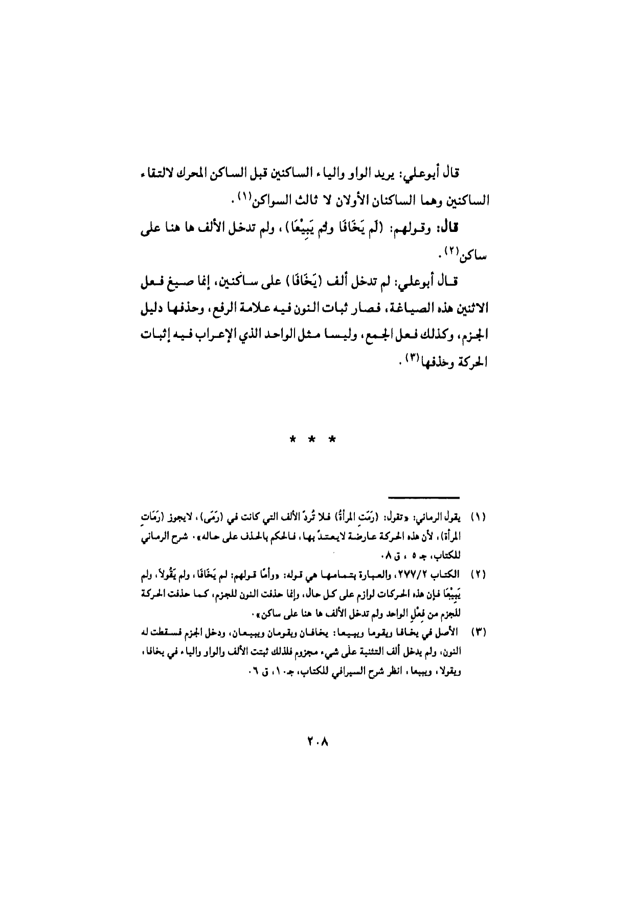قال أبو علي: لم تدخل ألف (يَخافَا) على ساكنين، إنما صيغ فعل الاثنين هذه الصياغة، فصار ثبات النون فيه علامة الرفع، وحذفها دليل الجزم، وذلك فعل الجمع، وليسا مثل الواحد الذي الإعراب فيه إثبات الحركة وحذفها.