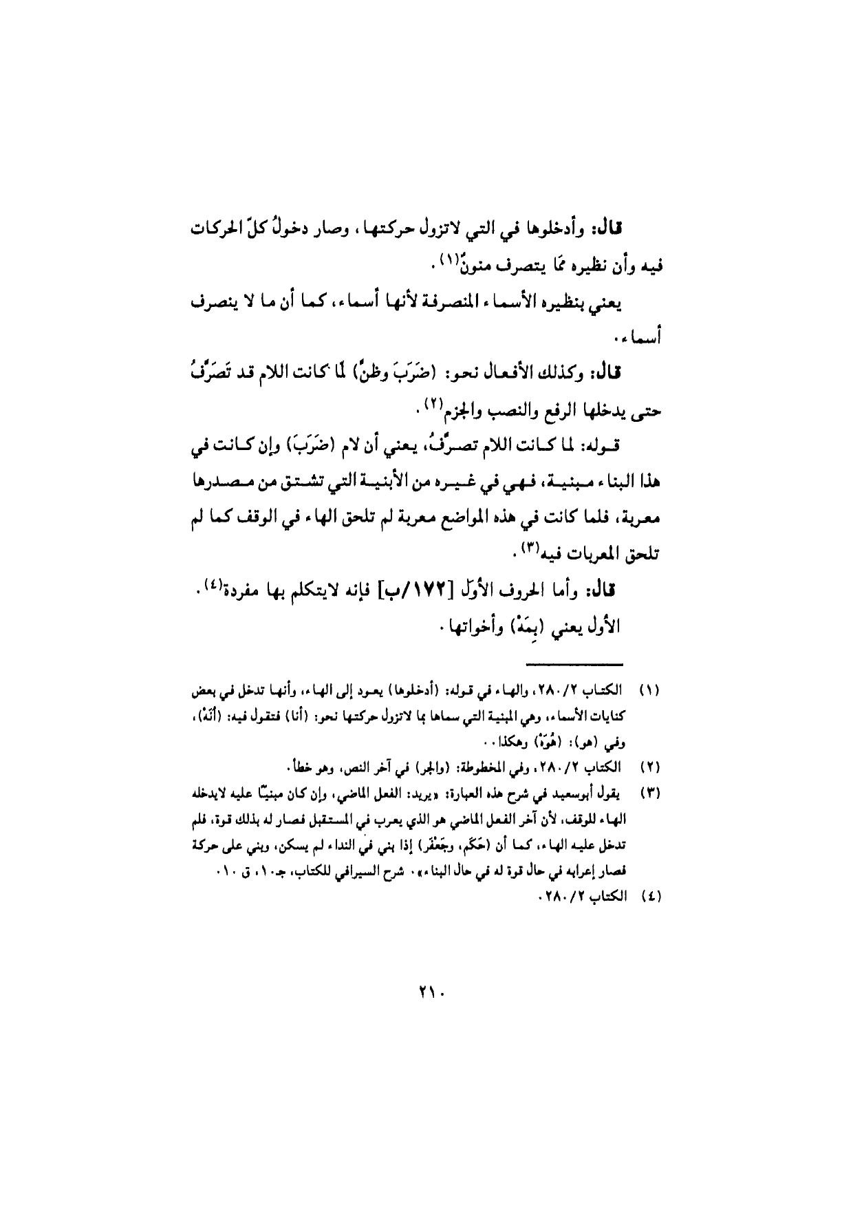 قوله: لما كانت اللام تصرَّفُ، يعني أن لام (ضَرَبَ) وإن كانت في هذا البناء مبنية، فهي في غيره من الأبنية التي تشتق من مصدرها معربة، فلما كانت في هذه المواضيع معربة لم تلحق الهاء في الوقف كما لم تلحق المعربات فيه.