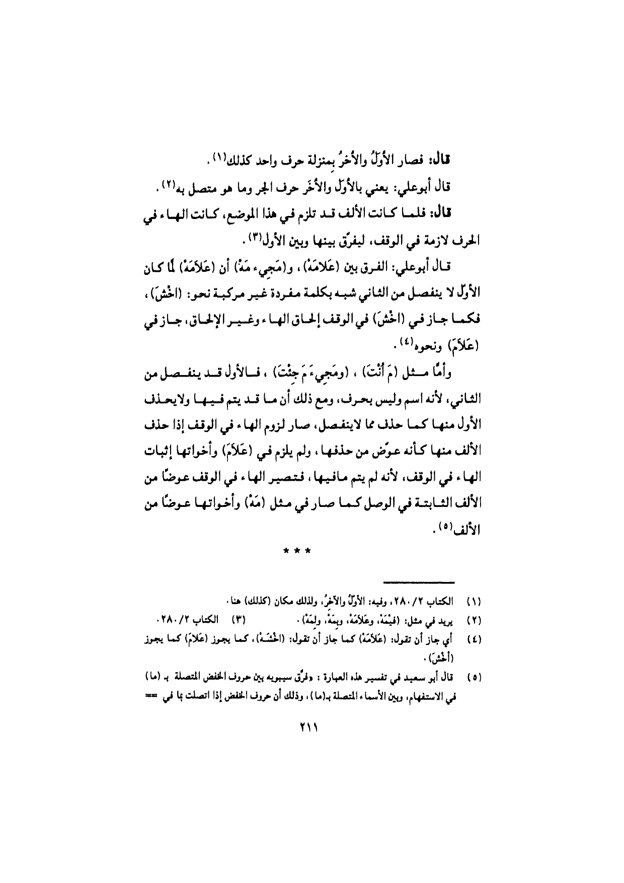 قال أبو علي: الفرق بين (عَلامَهْ)، و (مَجيء مَهْ) أن (عَلامَهْ) لمّا كان الأوّل لا ينفصل من الثاني شبه بكلمة مفردة غير مركبة نحو: (اخْشَ)، فكما جاز في (اخْشَ) في الوقف إلحاق الهاء وغير الإلحاق، جاز في (عَلامَ) ونحوه.