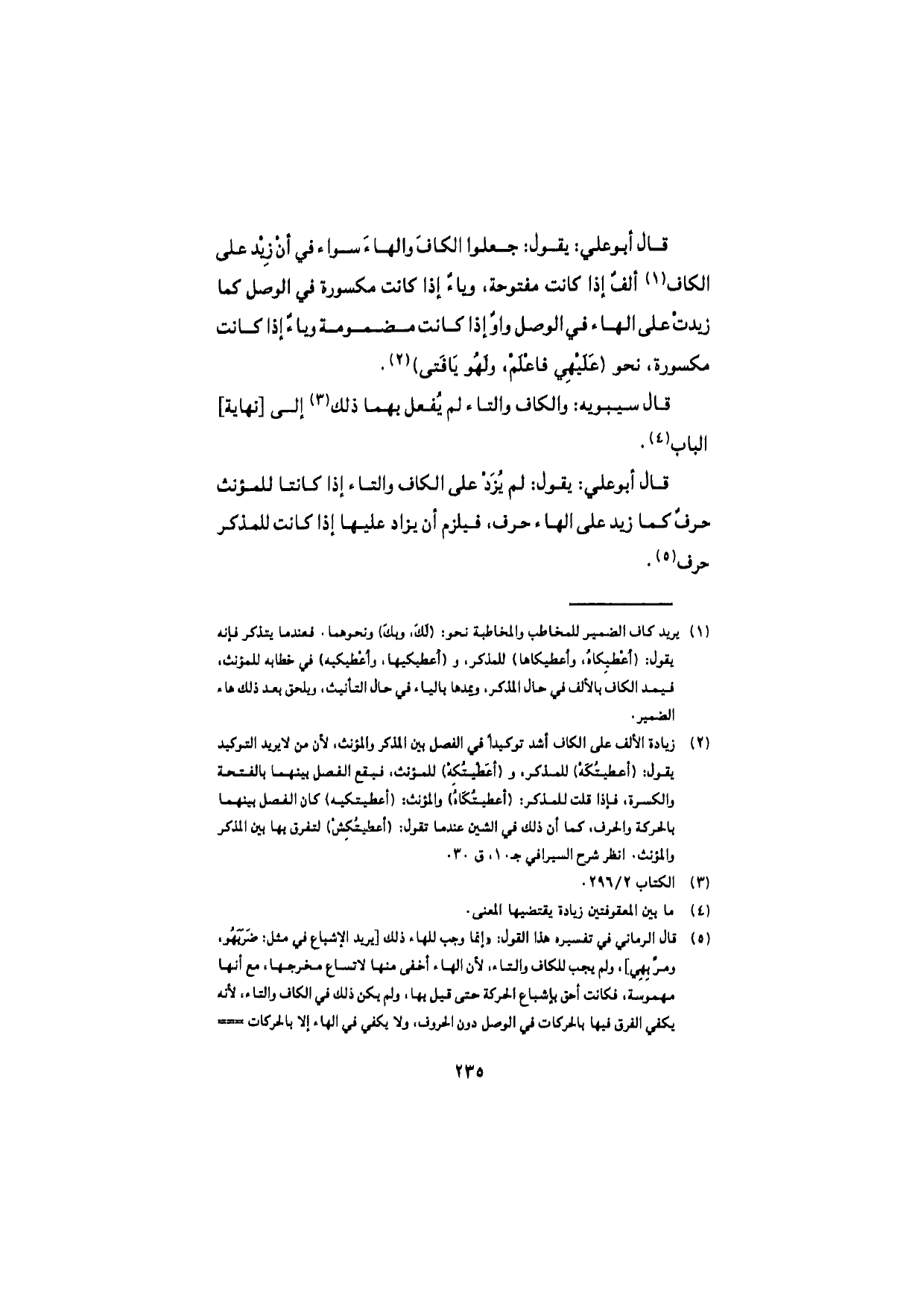 قال أبو علي: يقول: جعلوا الكاف والهاء سواء في أنْ زيد على الكاف ألفٌ إذا كانت مفتوحة، وياءٌ إذا كانت مكسورة في الوصل كما زيدت على الهاء في الوصل واوٌ إذا كانت مضمومة وياءٌ إذا كانت مكسورة، نحو (عَلَيْهِي فاعْلَمْ، ولَهُو يا فتى).