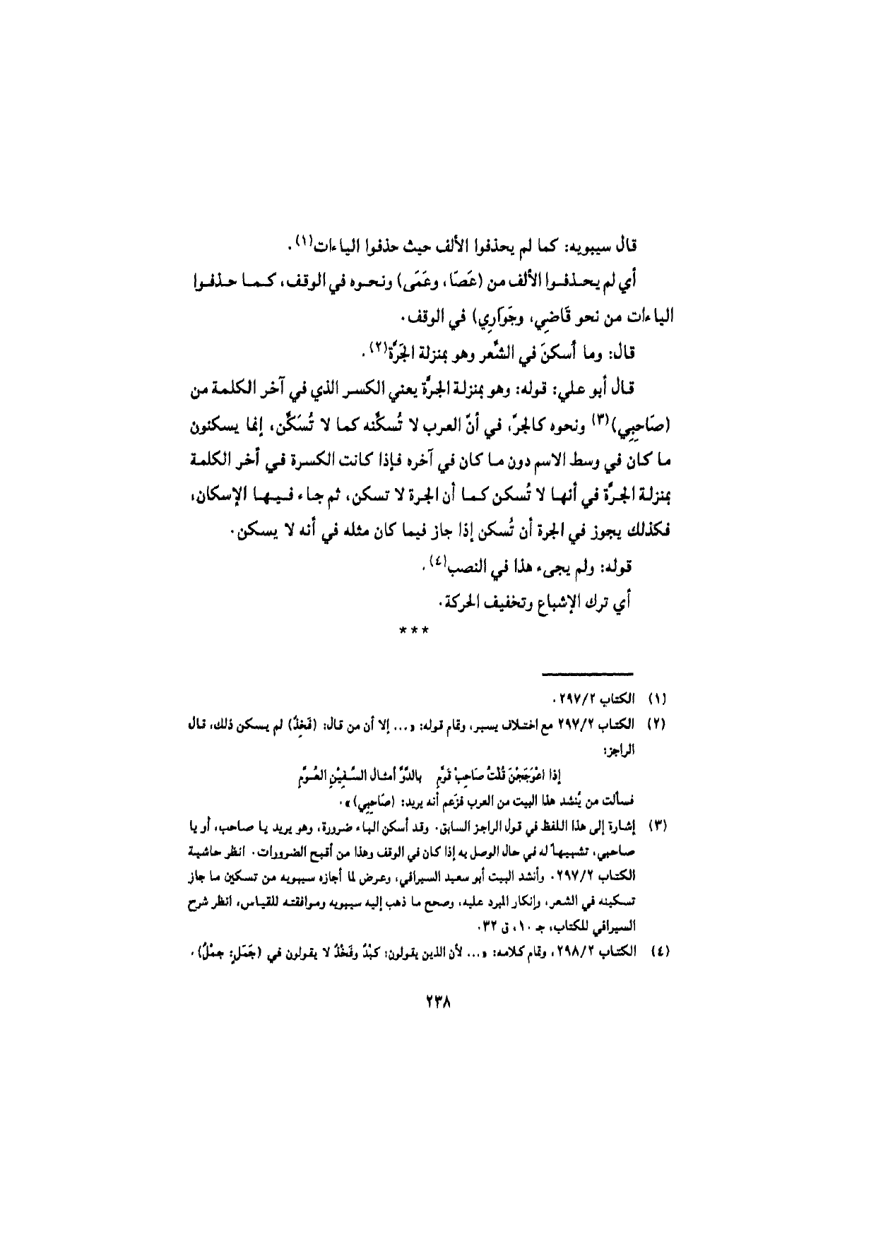 قال أبو علي: قوله: وهو بمنزلة الجرَّة يعني الكسر الذي في آخر الكلمة من (صاحِبِي) ونحوه كالجرّ، في أنّ العرب لا تُسكِّنه كما لا تُسَكّن، إنما يسكنون ما كان في وسط الاسم دون ما كان في آخره فإذا كانت الكسرة في آخر الكلمة بمنزلة الجرَّة في أنها لا تُسكن كما أن الجرة لا تسكن، ثم جاء فيها الإسكان، فكذلك يجوز في الجرة أن تُسكن إذا جاز فيما كان مثله في أنه لا يسكن.