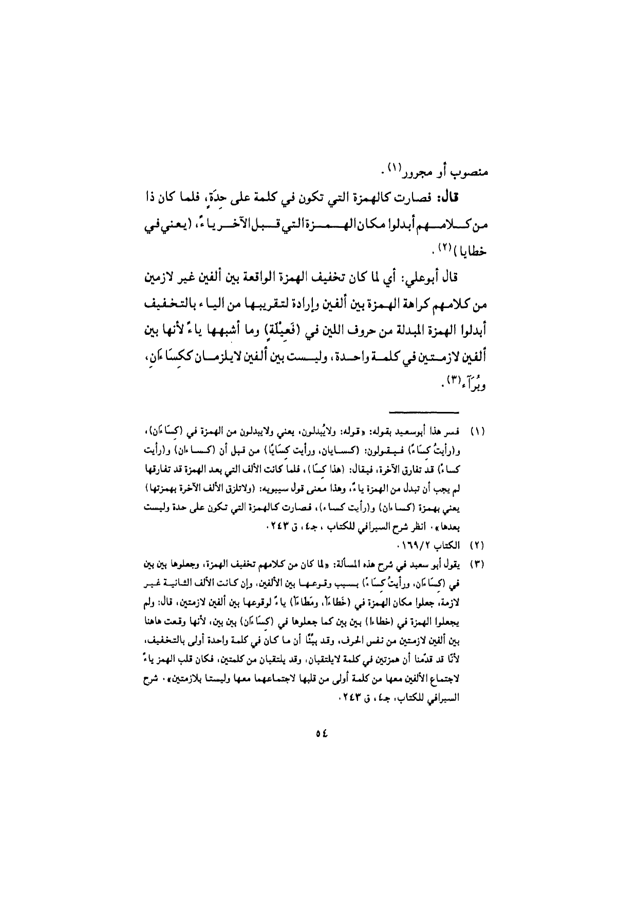 قال أبو علي: أي لما كان تخفيف الهمزة الواقعة بين ألفين غير لازمين من كلامهم كراهة الهمزة بين ألفين وإرادة لتقريبها من الياء بالتخفيف أبدلوا الهمزة المبدلة من حروف اللين في (فَعِيلةٍ) وما أشبهها ياءً لأنها بين ألفين لازمتين في كلمة واحدة، وليست بين ألفين لا يلزمان ككِساءَانِ، وبُرَآء.