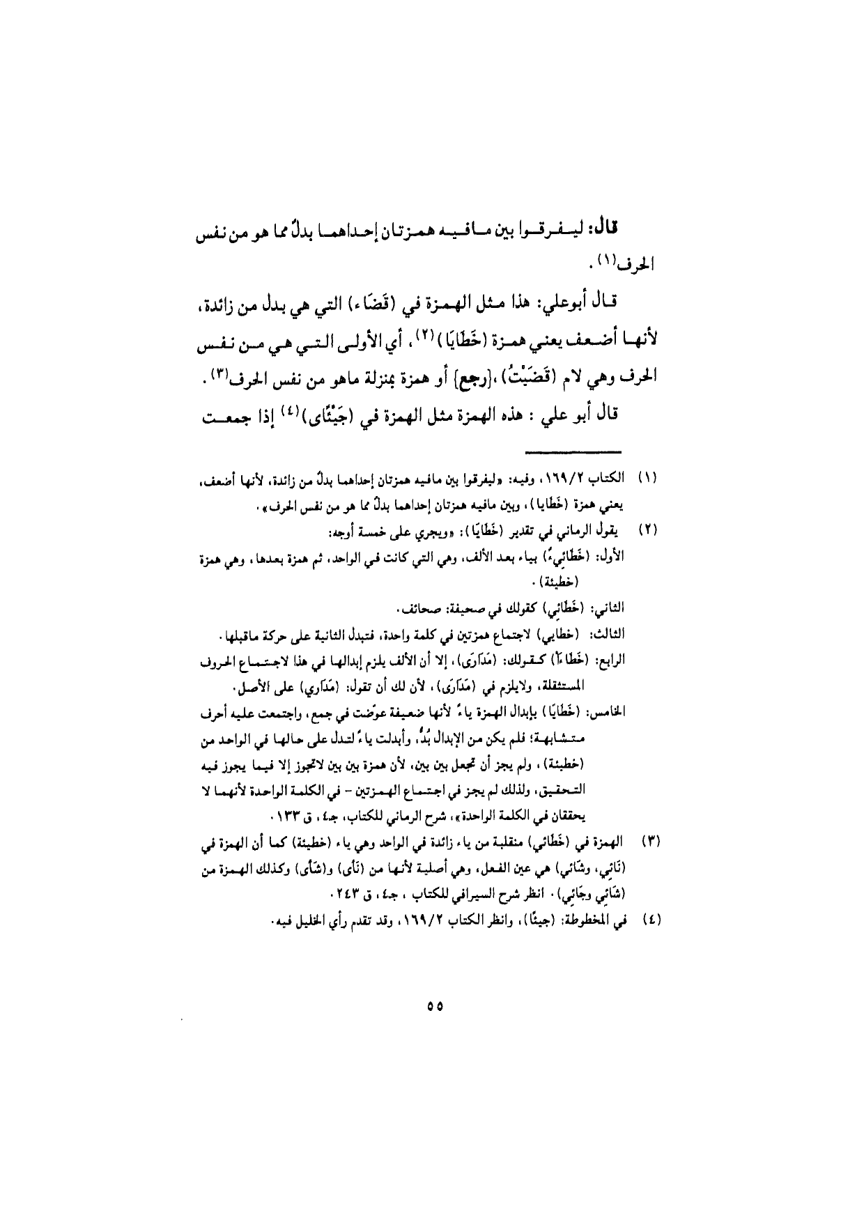 قال أبو علي: هذا مثل الهمزة في (قَضاء) التي هي بدل من زائدة، لأنها أضعف يعني همزة (خَطايا)، أي الأولى التي هي من نفس الحرف وهي لام (قَضَيْتُ)، {رجع} أو همزة بمنزلة ما هو من نفس الحرف.