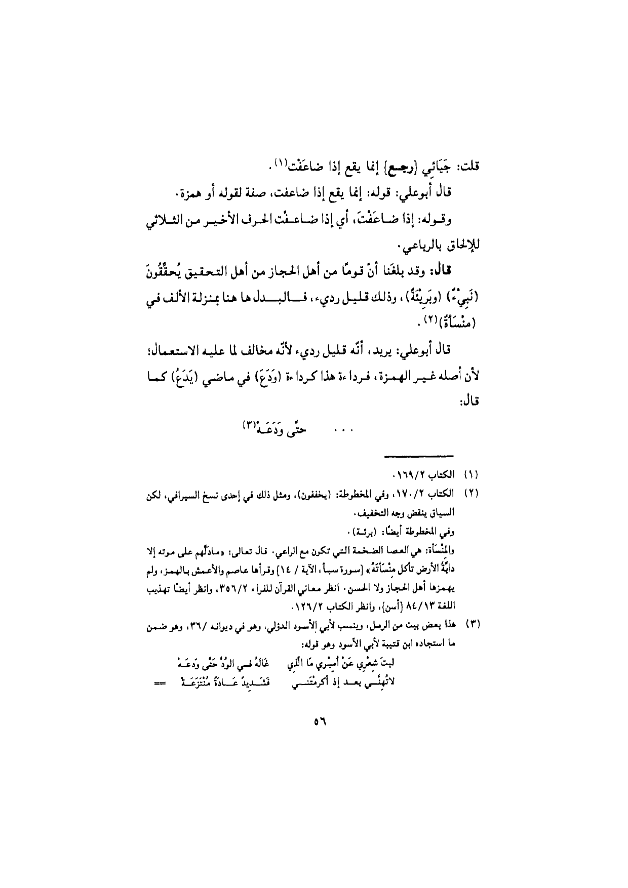 قال: وقد بَلغَنا أنّ قومًا من أهل الحجاز من أهل التحقيق يُحقِّقون (نَبِيءٌ) (وبَرِيئَةٌ)، وذلك قليل رديء، فالبدل ها هنا بمنزلة الألف في (مَنْسَأةٌ).