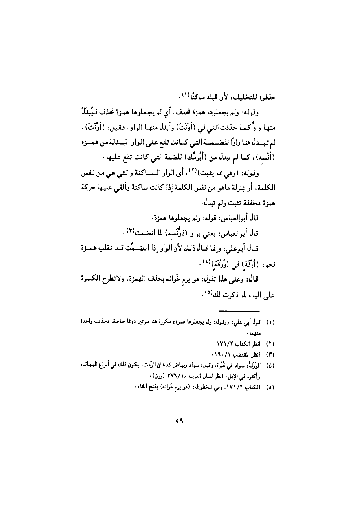 وقوله: ولم يجعلوها همزة تحذف، أي لم يجعلوها همزة تحذف فيُبدَلُ منها واوٌ كما حذفت التي في (أوَنْتَ) وأبدل منها الواو، فقيل: (أوَّنْتَ)، لم تبدل هنا واوًا للضمة التي كانت تقع على الواو المبدلة من همزة (أنْسِه)، كما لم تبدل من (أبُومِّك) للضمة التي كانت تقع عليها.
