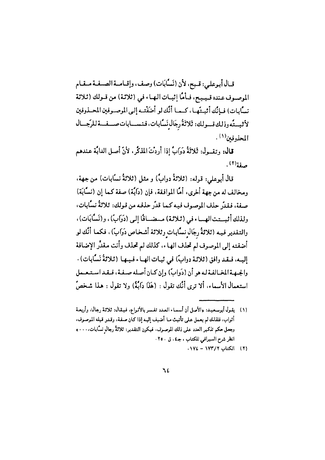 قال أبو علي: قوله: (ثلاثةُ دوابّ) ومثل (ثلاثةُ نسّابات) من جهة، ومخالف له من جهة أخرىن أمّا الموافقة، فإن (دابَّة) صفة كما إن (نسَّابة) صفة، فقدّر حذف الموصوف فيه كما قدّر حذفه من قولك: ثلاثةُ نسّابات، ولذلك أثبتت الهاء في (ثلاثة) مضافًا إلى (دوابّ)، و (نَسّابات)، والتقدير فيه (ثلاثةُ رجالٍ نسّابات وثلاثة أشخاص دوابّ)، فكما أنّك لو أضفته إلى الموصوف لم تحذف الهاء، كذلك لم تحذف وأنت مقدّر الإضافة إليه، فقد وافق (ثلاثة دوابّ) في ثبات الهاء فيها (ثلاثةُ نسّابات). والجهة المخالفة له هو أن (دوابّ) وإن كان أصله صفة، فقد استعمل استعمال الأسماء، ألا ترى أنّك تقول: (هذا دابَّةٌ) ولا تقول: هذا شخصٌ