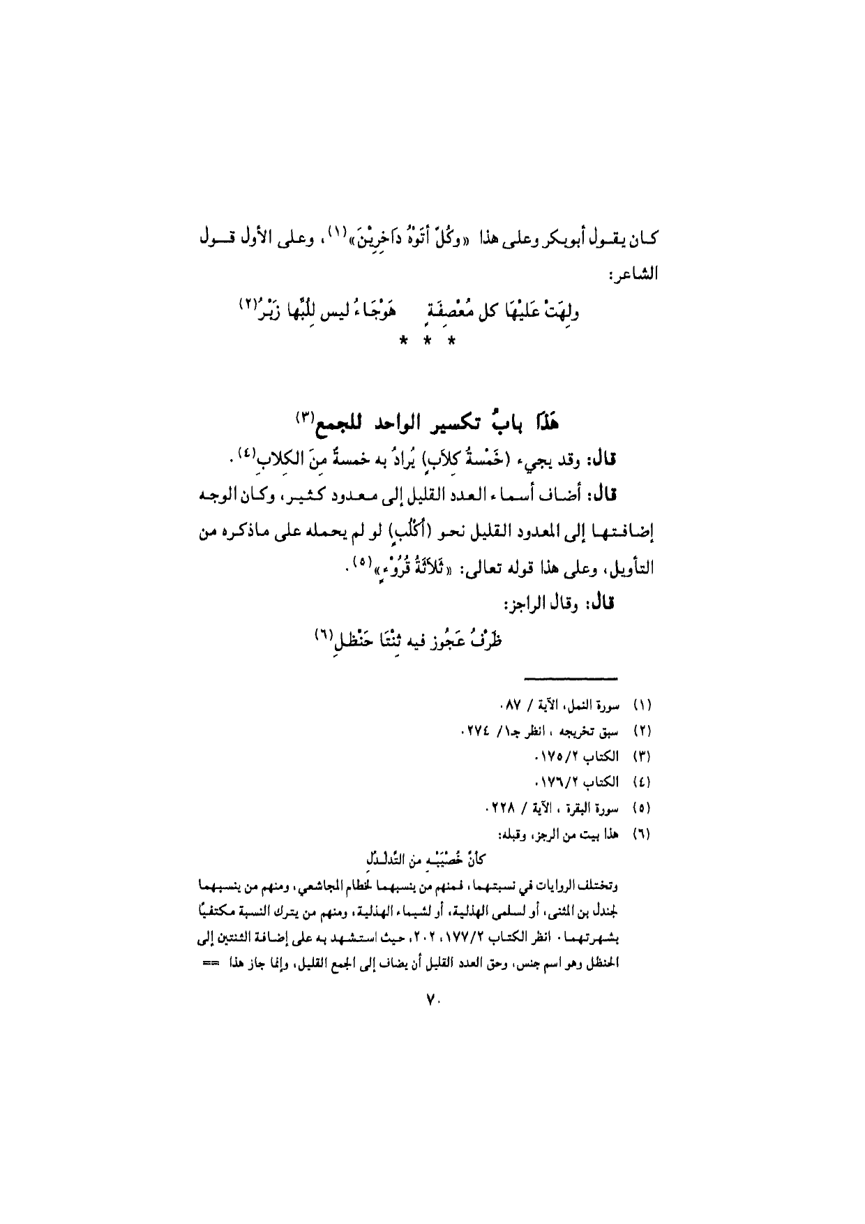 قال: أضاف أسماء العدد القليل إلى معدود كثير، وكان الوجه إضافتها إلى المعدود القليل نحو (أكْلُبٍ) لو لم يحمله على ما ذكره من التأويل، وعلى هذا قوله تعالى: "ثلاثةُ قُرُوءٍ".