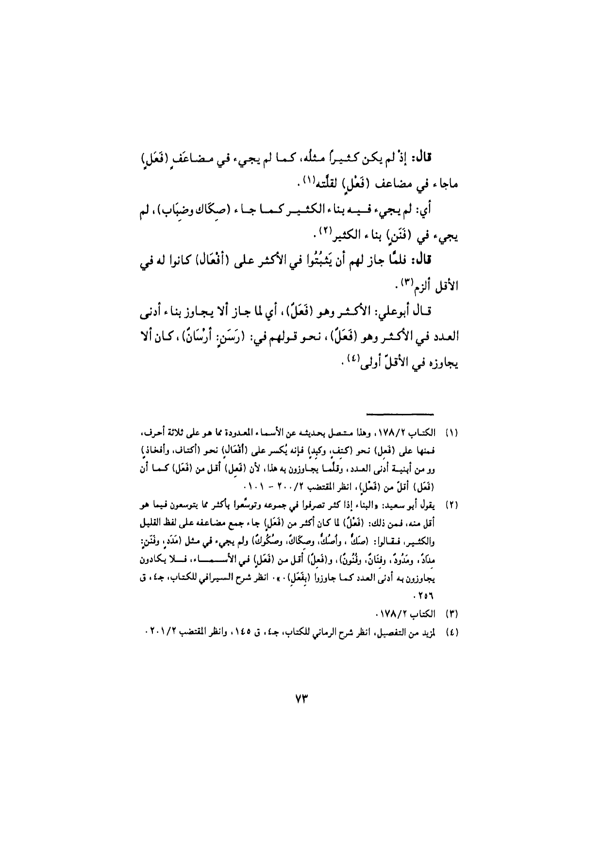 قال أبو علي: الأكثر وهو (فَعَلٌ)، أي لما جاز ألا يجاوز بناء أدنى العدد في الأكثر وهو (فَعَلٌ)، نحو قولهم في: (رَسَنٍ: أرْسانٌ)، كان ألا يجاوزه في الأقلّ أولى.