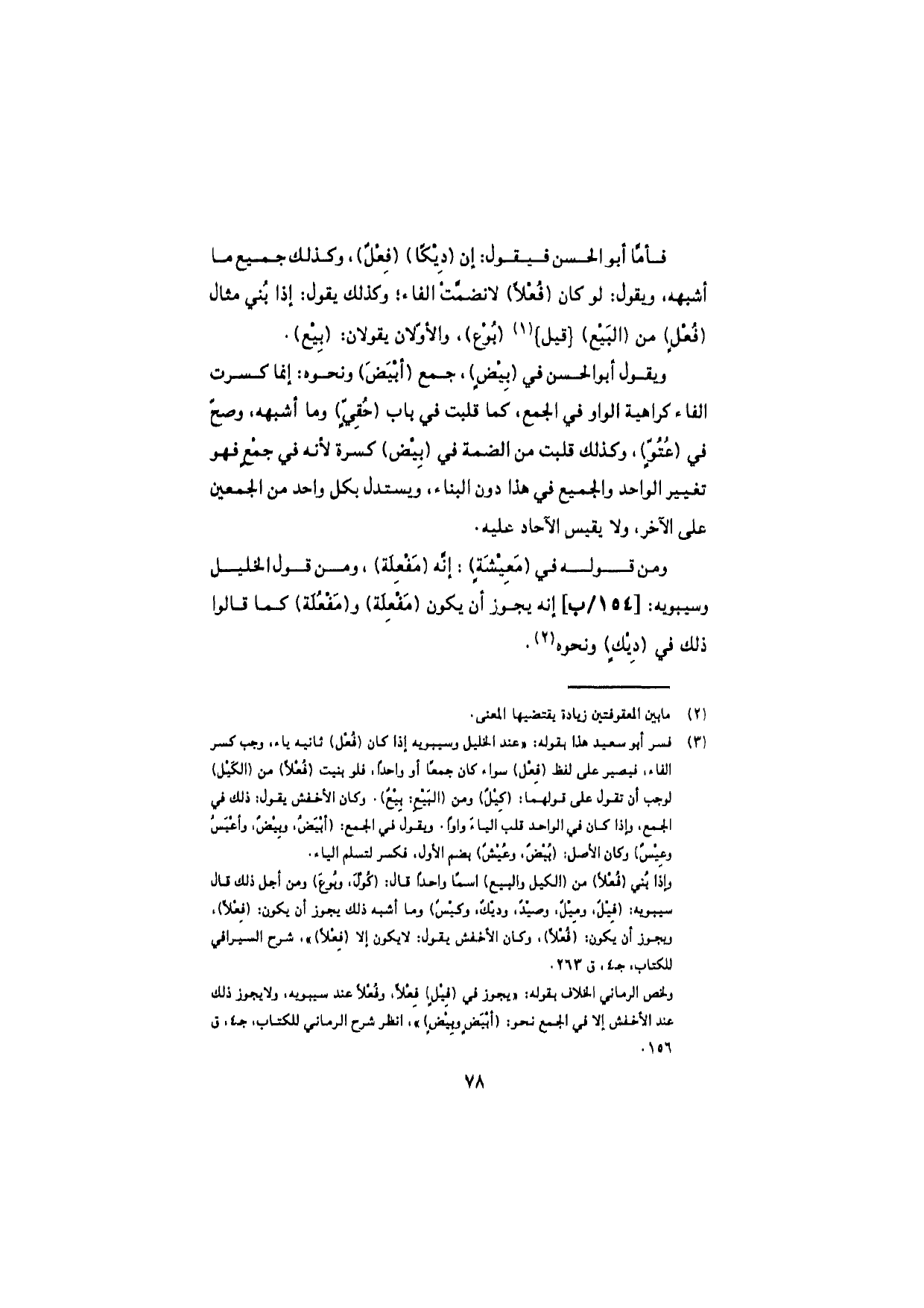 ويقول أبو الحسن في (بِيضٍ)، جمع (أبْيَضَ) ونحوه: إنما كسرت الفاء كراهية الواو في الجمع، كما قلبت في باب (حُقِيٍّ) وما أشبهه، وصحّ في (عُتُوٍّ)، وكذلك قلبت من الضمة في (بِيض) كسرة لأنه في جمعٍ فهو تغيير الواحد والجميع في هذا دون البناء، ويستدل بكل واحد من الجمعين على الآخر، ولا يقيس الآحاد عليه.