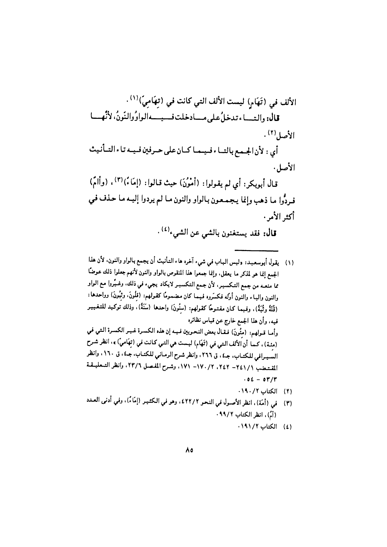 قال أبو بكر: أي لم يقولوا: (أمونَ) حيث قالوا: (إماءٌ)، (وأامٌ) فردُّوا ما ذهب وإنما يجمعون بالواو والنون ما لم يردوا إليه ما حذف في أكثر الأمر.