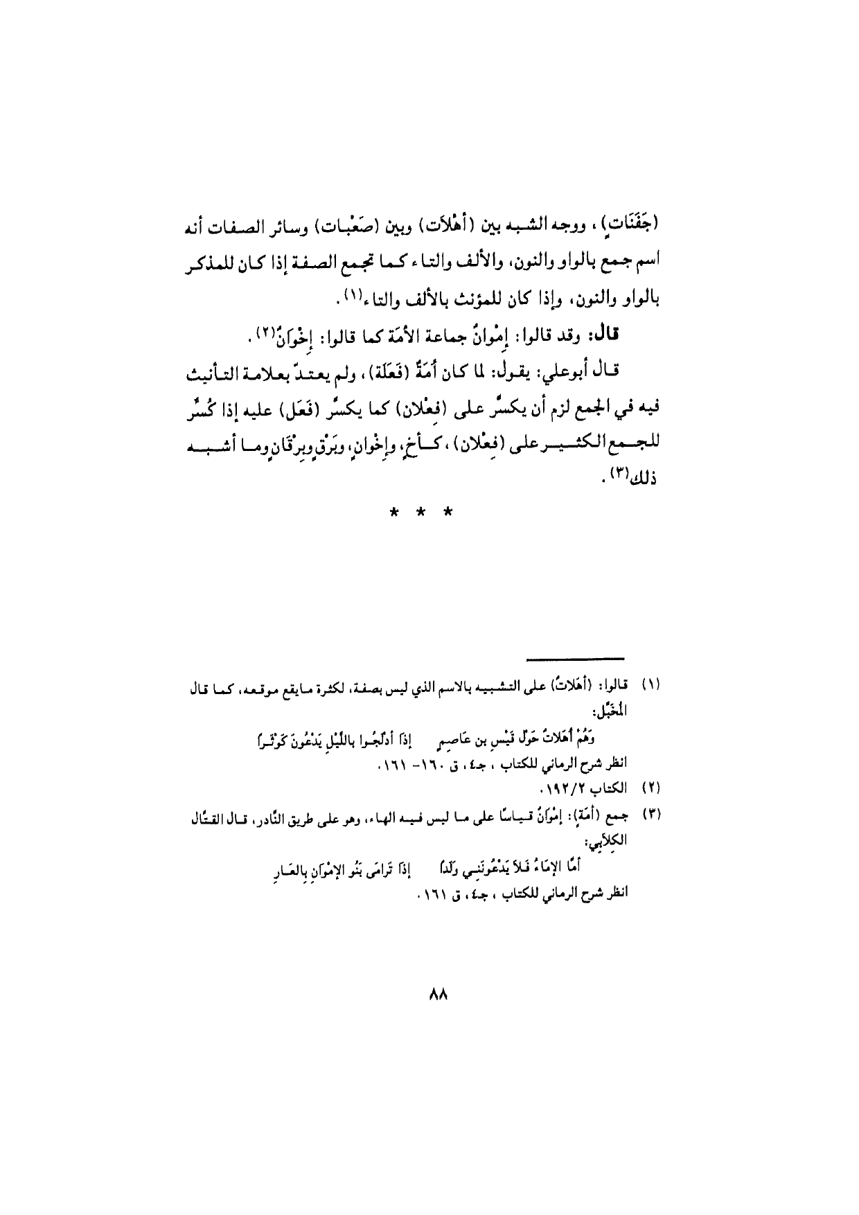 (جَفَناتٍ)، ووجه الشبه بين (أهْلات) وبين (صَعْبات) وسائر الصفات أنه اسم جمع بالواو والنون، والألف والتاء كما تجمع الصفة إذا كان للمذكر بالواو والنون، وإذا كان للمؤنث بالألف والتاء.