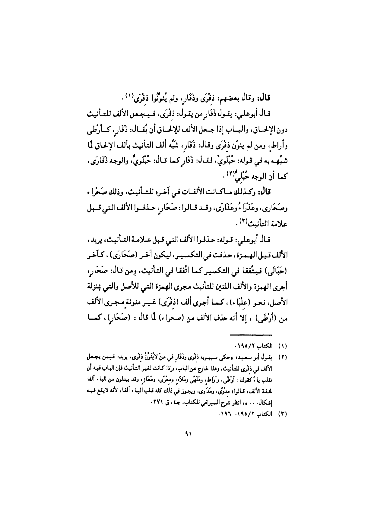 قال أبو علي: قوله: حذفوا الألف التي قبل علامة التأنيث، يريد، الألف قبل الهمزة، حذفت في التكسير، ليكون آخر (صَحارى)، كآخر (حَبالى) فيتَّفقا في التكسير كما اتّفقا في التأنيث، ومن قال: صَحارٍ، أجرى الهمزة والألف اللتين للتأنيث مجرى الهمزة التي للأصل والتي بمنزلة الأصل، نحو (عِلْباء)، كما أجرى ألف (ذِفْرَى) غير منونة مجرى الألف من (أرْطَى)، إلا أنه حذف الألف من (صحراء) لمّا قال: (صَحارٍ)، كما