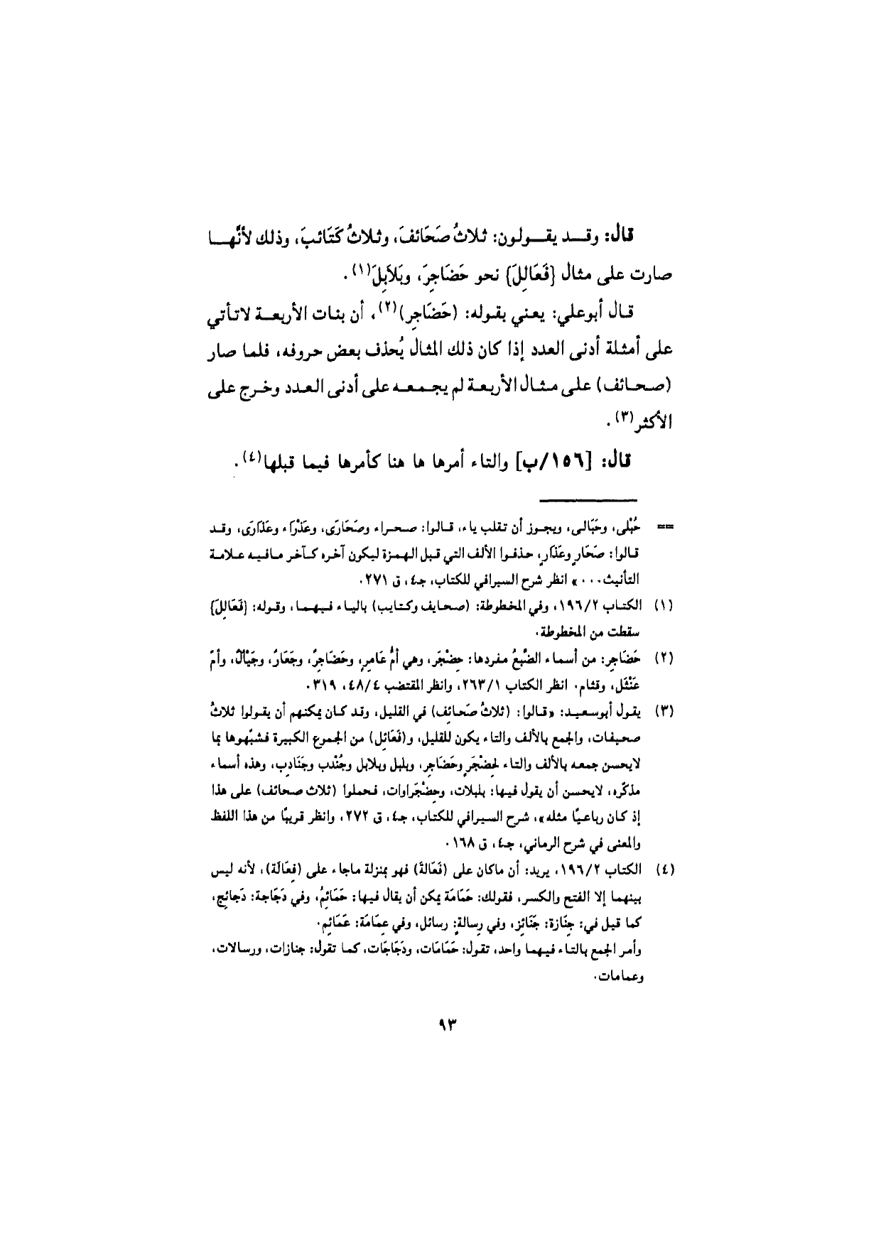 قال أبو علي: يعني بقوله: (حَضاجِر)، أن بنات الأربعة لا تأتي على أمثلة أدنى العدد إذا كان ذلك المثال يُحذف بعض حروفه، فلما صار (صحائف) على مثال الأربعة لم يجمعه على أدنى العدد وخرج على الأكثر.