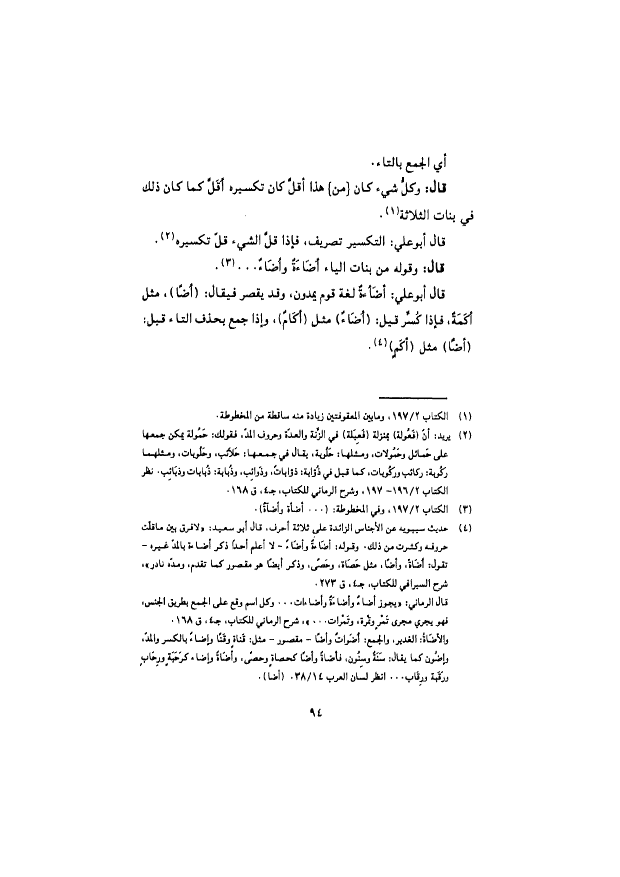 قال أبو علي: أضاءةٌ لغة قوم يمدون، وقد يقصر فيقال: (أضًا)، مثل أكَمَةٌ، فإذا كُسِّر قيل: (أضاءٌ) مثل (أكامٌ)، وإذا جمع بحذف التاء قيل: (أضا) مثل (أكَمٍ).