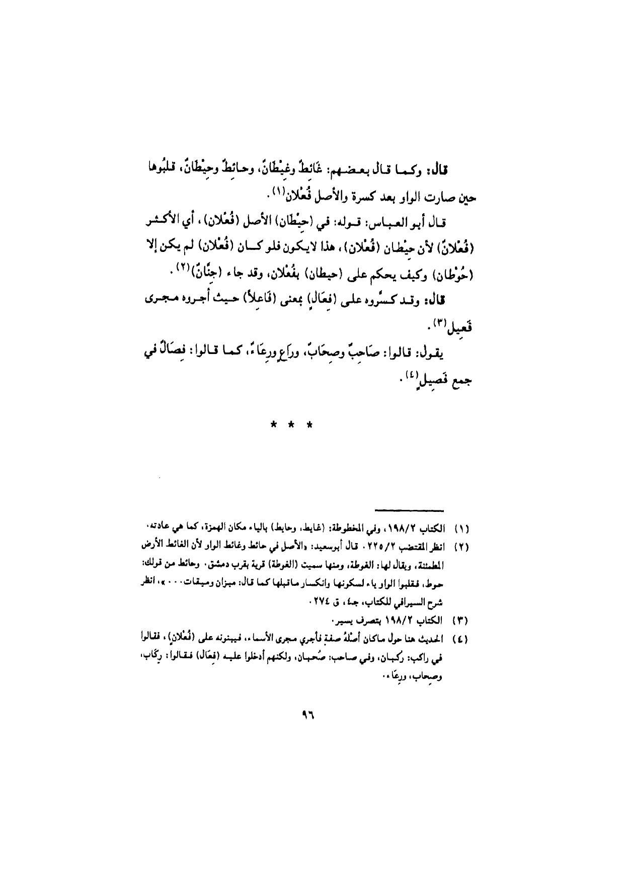 قال أبو العباس: قوله: في (حِيطان) الأصل (فُعْلان)، أي الأكثر (فُعْلان) لأن حيطان (فُعْلان)، هذا لا يكون فلو كان (فُعْلان) لم يكن إلا (حُوطان) وكيف يحكم على (حيطان) بفُعْلان، وقد جاء (جِنَّانٌ).