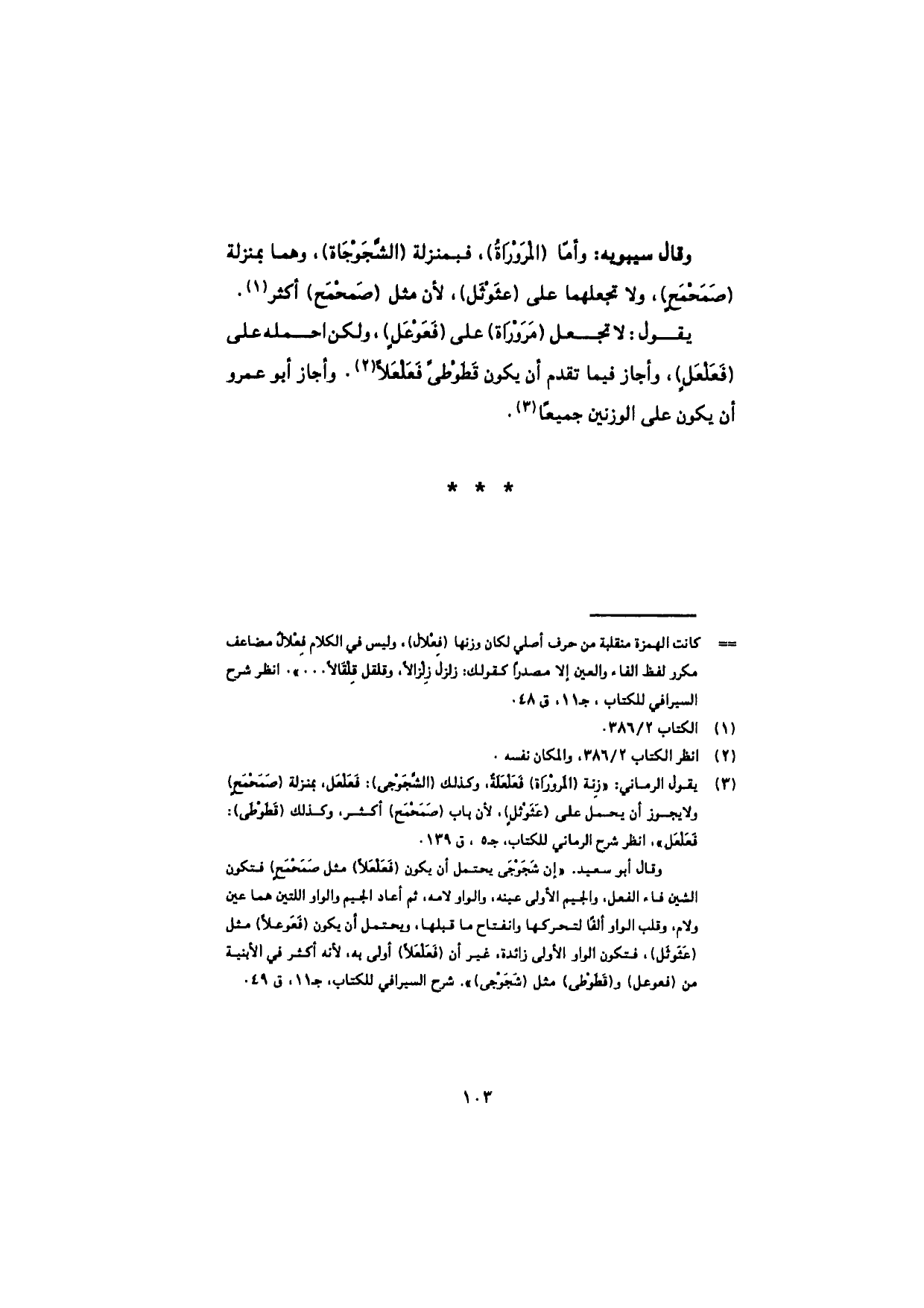 وقال سيبويه: وأمّا (المَرروْراةُ)، فبمنزلة (الشَّجَوْجاة)، وهما بمنزلة (صَمَحْمَحٍ)، ولا تجعلهما على (عثَوْثَل)، لأن مثل (صَمَحْمَح) أكثر.
