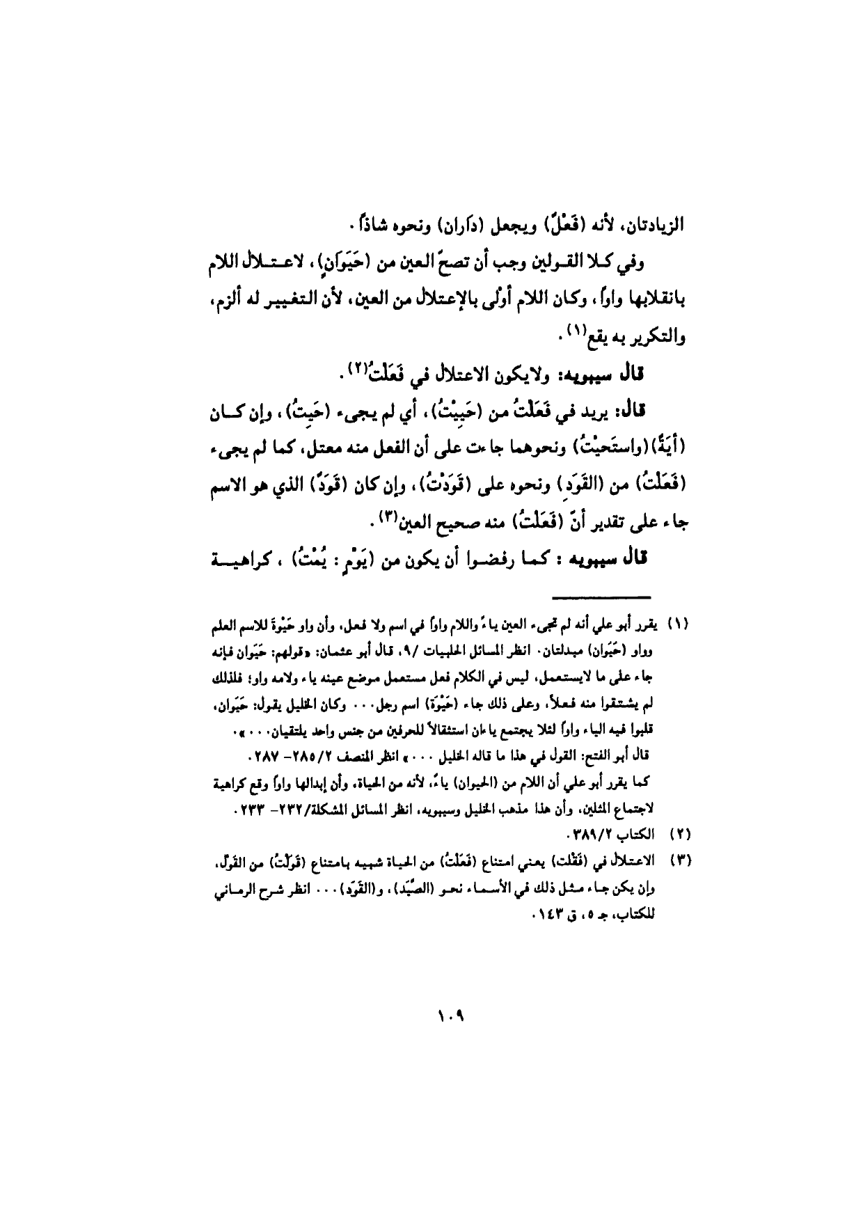 وفي كلا القولين وجب أن تصحّ العين من (حَيَوانٍ)، لاعتلال اللام بانقلابها واوًا، وكان اللام أوْلى بالاعتلال من العين، لأن التغيير له ألزم، والتكرير به يقع.