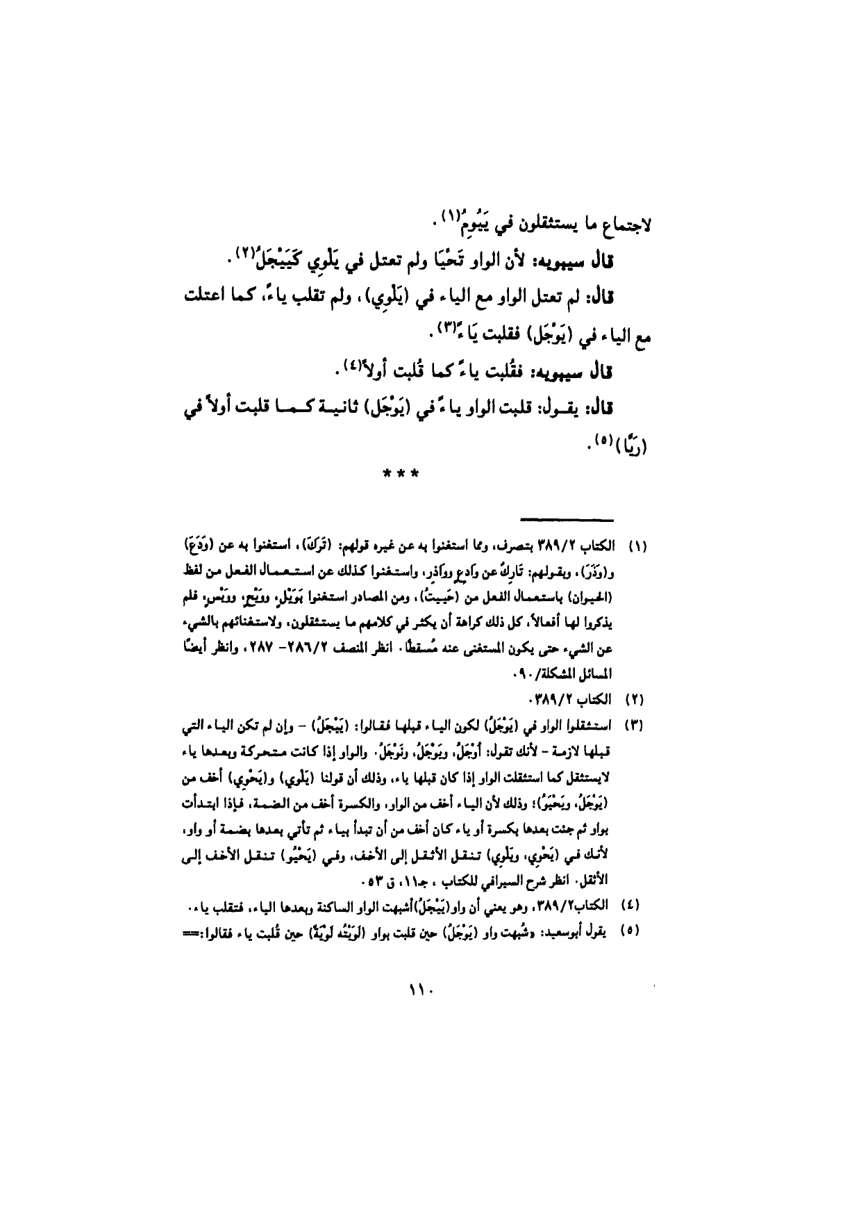 قال: لم تعتل الواو مع الياء في (يَلْوِي)، ولم تقلب ياء، كما اعتلت مع الياء في (يَوْجَل) فقلبت ياء.
