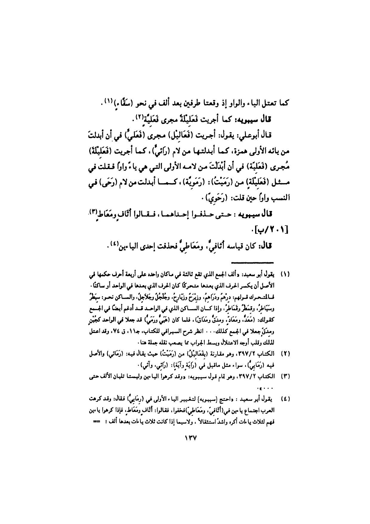 قال سيبويه: حتى حذفوا إحداهما، فقالوا أثافٍ ومَعاطٍ [201/ب].