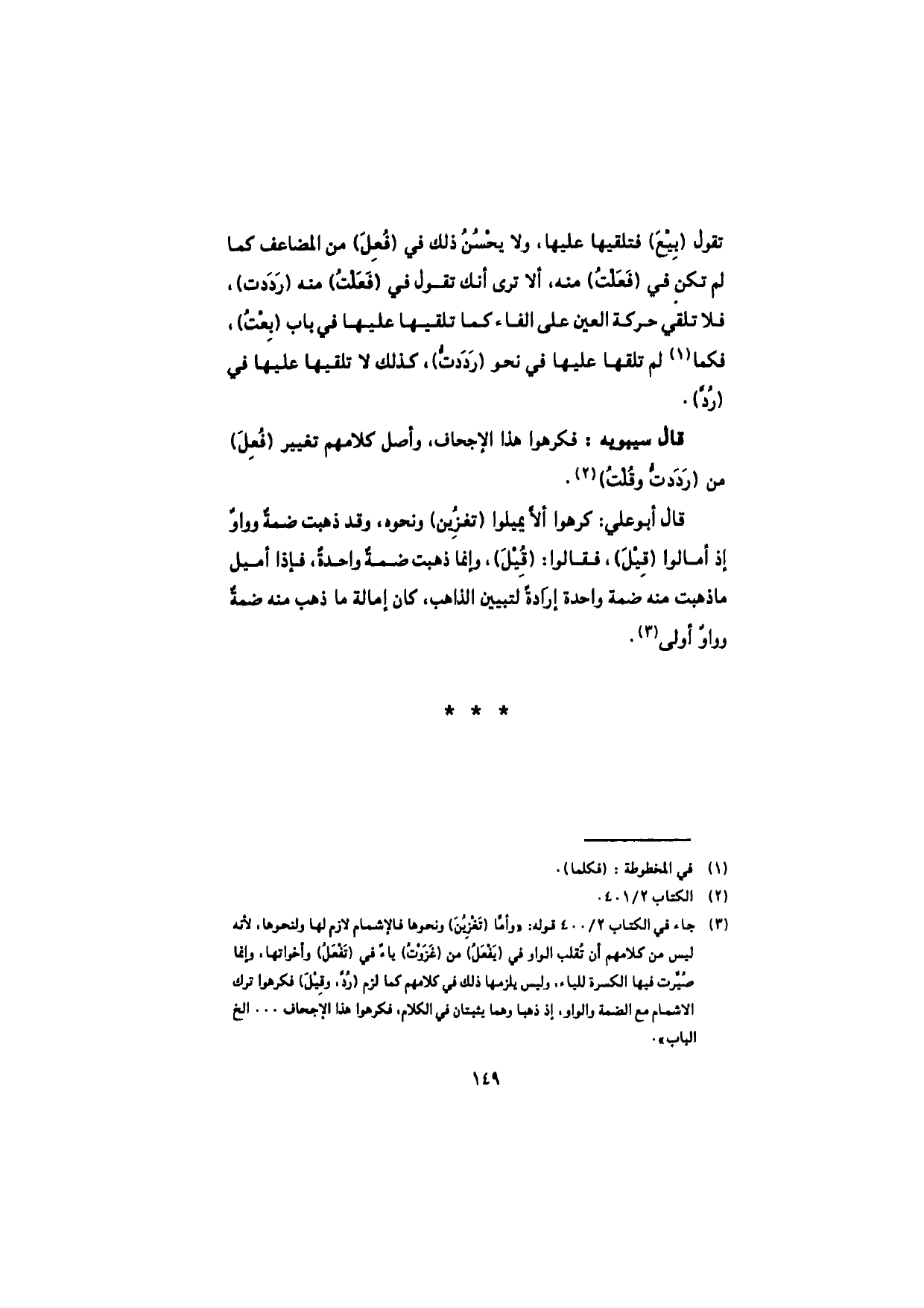 قال سيبويه: فكرهوا هذا الإجحاف، وأصل كلامهم تغيير (فُعِلَ) من (رَددتُّ وقُلْتُ).