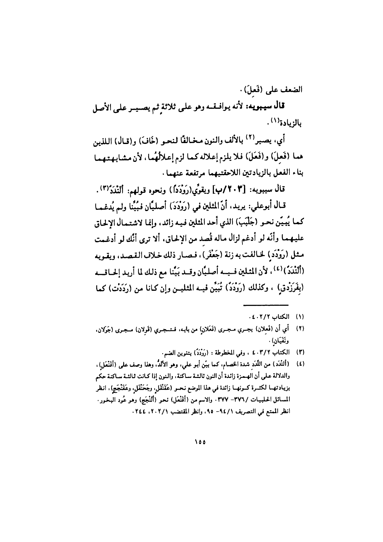 قال أبو علي: يريد، أنّ المثلين في (رَوْدَدَ) أصليّان فبُيِّنا ولم يُدغما كما يُبيّن نحو (جَلْبَبَ) الذي أحد المثلين فيه زائد، وإنما لاشتمال الإلحاق عليهما وأنّه لو أدغم لزال ماله قُصِد من الإلحاق، ألا ترى أنّك لو أدغمت مثل (رَوْدَدٍ) لخالفت به زنة (جَعْفَر)، فصار ذلك خلاف القصد، ويقويه (ألَنْدَدٌ)، لأن المثلين فيه أصليّان وقد بَيَّنا مع ذلك لما أريد إلحاقه (بفَرَزْدَقٍ)، وكذلك (رَوْدَدٌ) تُبَيِّن فيه المثلين وإن كانا من (رَدَدْت) كما