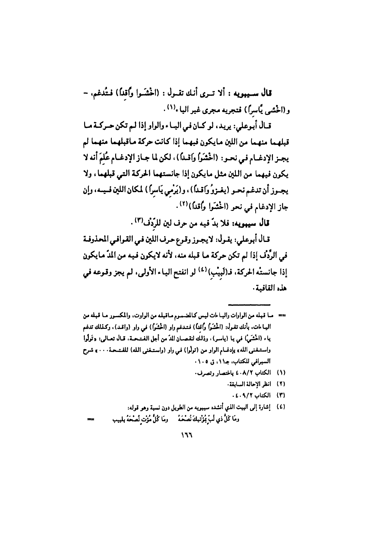 قال سيبويه: ألا ترى أنك تقول: (اخْشَوا وّاقِدًا) فتُدغم، - و (اخْشى يّاسِرًا) فتجريه مجرى غير الياء.