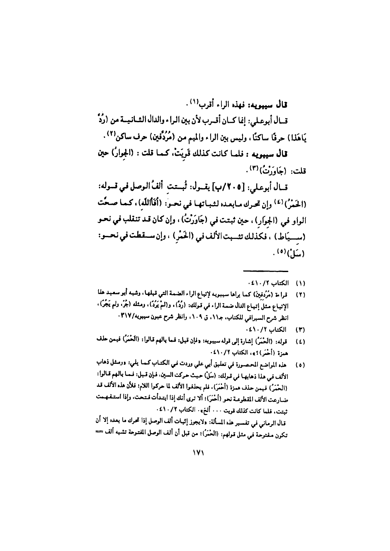قال أبو علي: [205/ب] يقول: ثُبتت ألفُ الوصل في قوله: (الحَمْرُ) وإن تحرك ما بعده لثباتها في نحو: (أفأاللهِ)، كما صحّت الواو في (الجِوارِ)، حين ثبتت في (جاوَرْتُ)، وإن كان قد تنقلب في نحو (سِياط)، فكذلك تثبت الألف في (الحَمْرِ)، وإن سقطت في نحو: (سَلْ).
