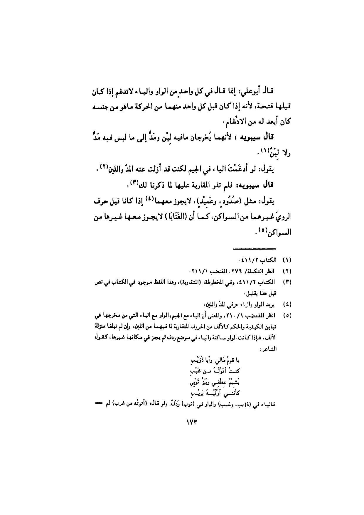قال أبو علي: إنما قال في كل واحد من الواو والياء لا تدغم إذا كان قبلها فتحة، لأنه إذا كان قبل كل واحد منهما من الحركة ما هو من جنسه كان أبعد له من الادّغام.