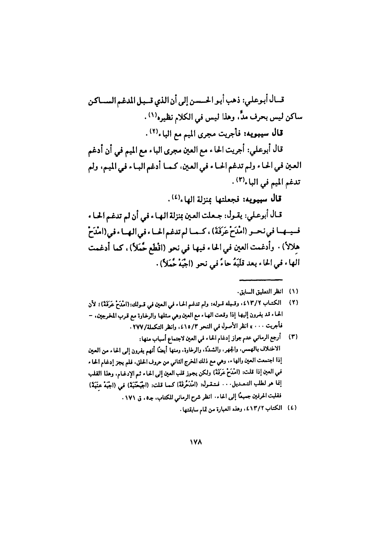 قال أبو علي: أجريت الحاء مع العين مجرى الباء مع الميم في أن أدغم العين في الحاء ولم تدغم الحاء في العين، كما أدغم الباء في الميم، ولم تدغم الميم في الباء.