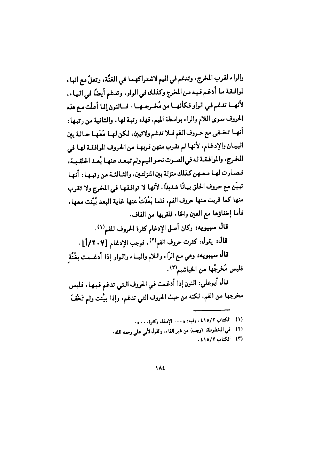 قال سيبويه: وهي مع الرّاء واللام والياء والواو إذا أدغمت بغنّةٍ فليس مُخرجُها من الخياشيم.