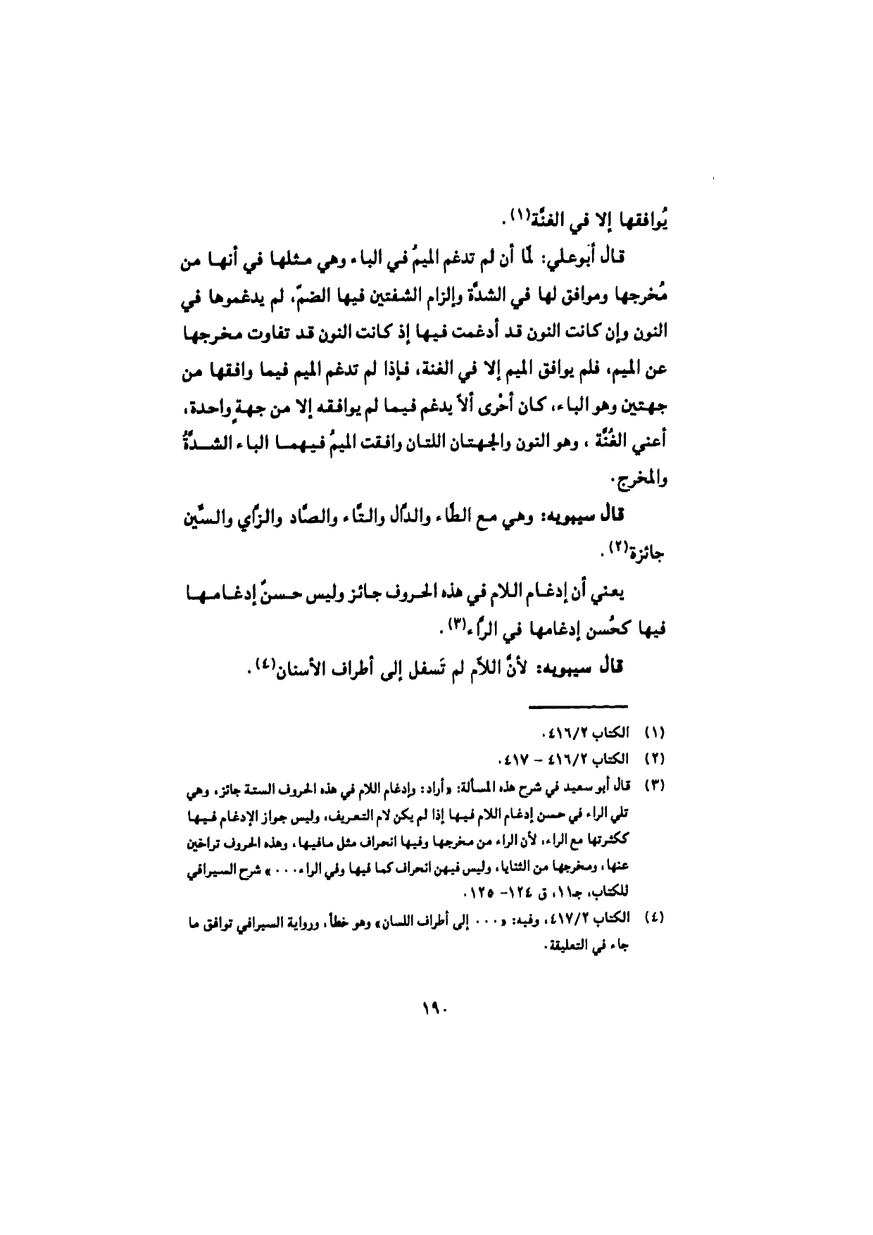 قال أبو علي: لما أن لم تدغم الميمُ في الباء وهي مثلها في أنها من مُخرجها وموافق لها في الشدَّة وإلزام الشفتين فيها الضمّ، لم يدغموها في النون وإن كانت النون قد أدغمت فيها إذ كانت النون قد تفاوت مخرجها عن الميم، فلم يوافق الميم إلا في الغنة، فإذا لم تدغم الميم فيما وافقها من جهتين وهو الباء، كان أحْرى ألاّ يدغم فيما لم يوافقه إلا من جهة واحدة، أعني الغُنَّة، وهو النون والجهتان اللتان وافقت الميمُ فيهما الباء الشدَّة والمخرج.
