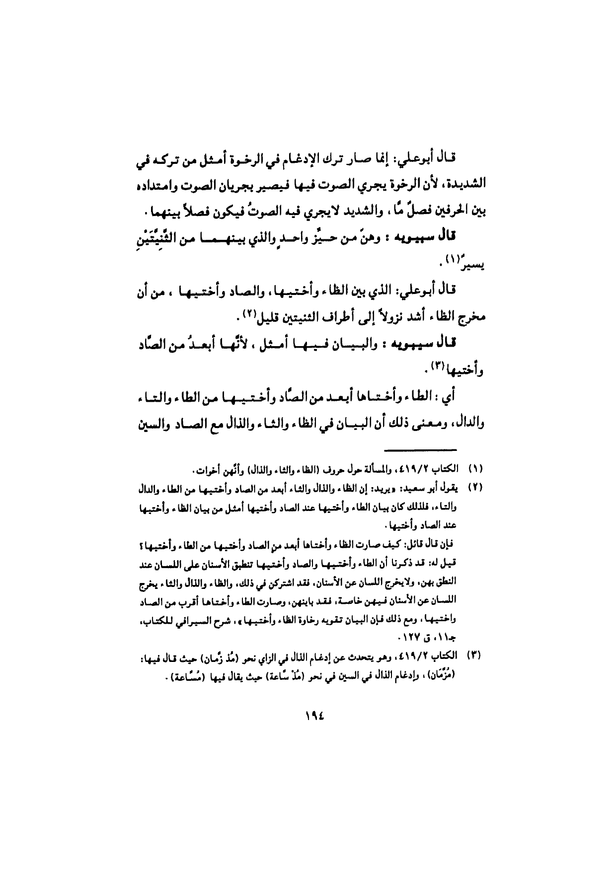 قال أبو علي: إنما صار ترك الإدغام في الرخوة أمثل من تركه في الشديدة، لأن الرخوة يجري الصوت فيها فيصير بجريان الصوت وامتداده بين الحرفين فصلٌ مّا، والشديد لا يجري فيه الصوتُ فيكون فصلاً بينهما.