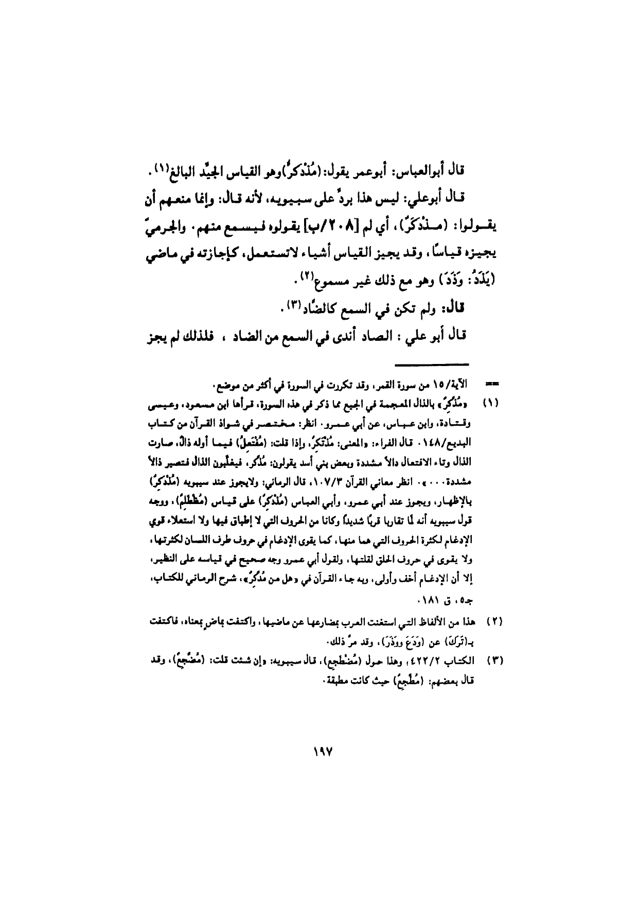 قال أبو علي: ليس هذا بردّ على سيبويه، لأنه قال: وإنما منعهم أن يقولوا: (مذْدكَرٌ)، أي لم [208/ب] يقولوه فيسمع منهم، والجرميّ يجيزه قياسًا، وقد يجيز القياس أشياء لا تستعمل، كإجازته في ماضي (يَذَدُ: وَذَدَ) وهو مع ذلك غير مسموع.