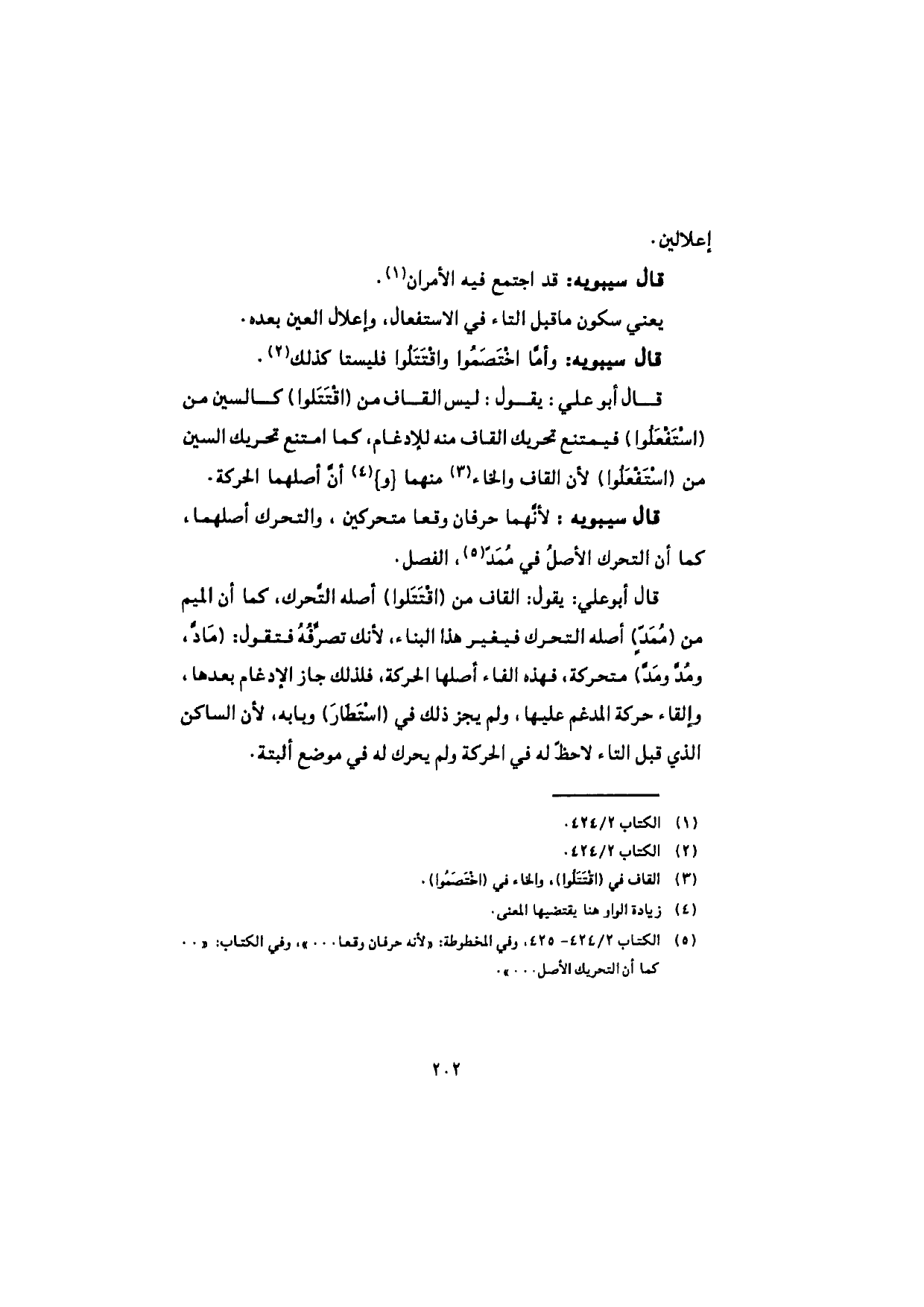 قال أبو علي: يقول: القاف من (اقْتَتَلُوا) أصله التَّحرك، كما أن الميم من (مُمَدٍّ) أصله التحرك فيغير هذا البناء، لأنك تصرِّفُهُ فتقول: (مادٌّ، ومُدّ، ومَدّ) متحركة، فهذه الفاء أصلها الحركة، فلذلك جاز الإدغام بعدها، وإلقاء حركة المدغم عليها، ولم يجز ذلك في (اسْتَطارَ) وبابه، لأن الساكن الذي قبل التاء لا حظَّ له في الحركة ولم يحرك له في موضع ألبتة.