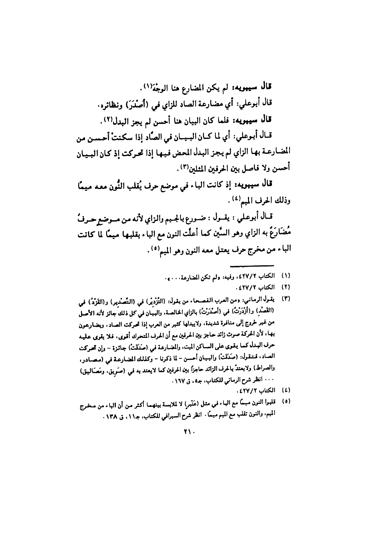 قال أبو علي: أي لما كان البيان في الصّاد إذا سكنت أحسن من المضارعة بها الزاي لم يجز البدل المحض فيها إذا تحركت إذ كان البيان أحسن ولا فاصل بين الحرفين المثلين.