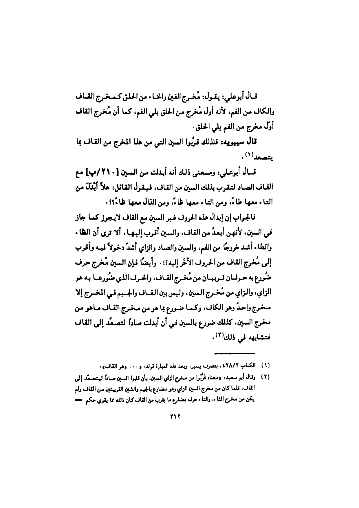 قال أبو علي: ومعنى ذلك أنه أبدلت من السن [210/ب] مع القاف الصاد لتقرب بذلك السين مع القاف، فيقول القائل: هلاَّ أبْدَلَ من التاء معها طاءً، ومن التاء معها ظاءً، ومن الذال معها ظاءً؟!.