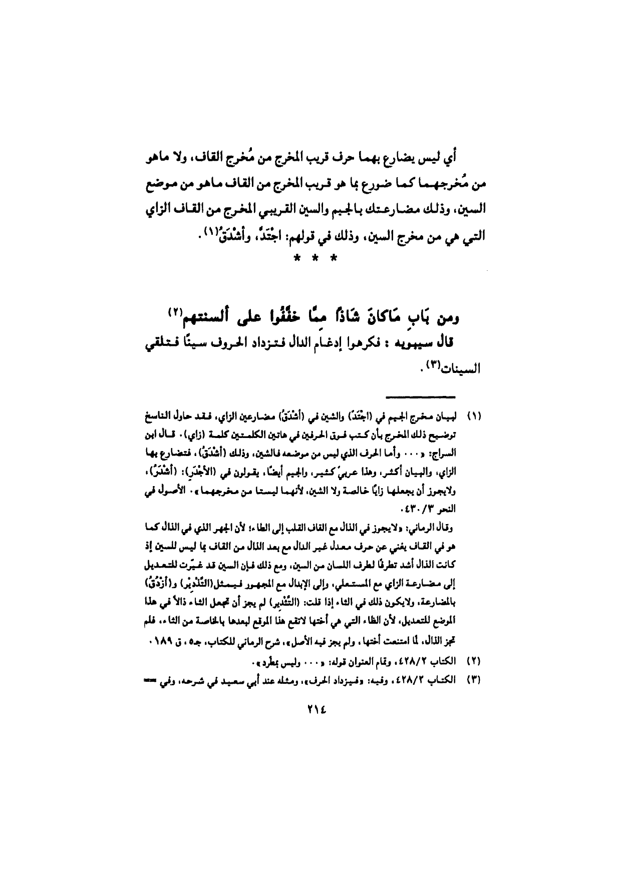 أي ليس يضارع بهما حرف قريب المخرج من مُخرج القاف، ولا ما هو من مُخرجهما كما ضورع بما هو قريب المخرج من القاف ما هو من موضع السين، وذلك مضارعتك بالجيم والسين القريبي المخرج من القاف والزاي التي هي من مخرج السين، وذلك في قولهم: اجْتَدَّ، وأشْدَقُ.