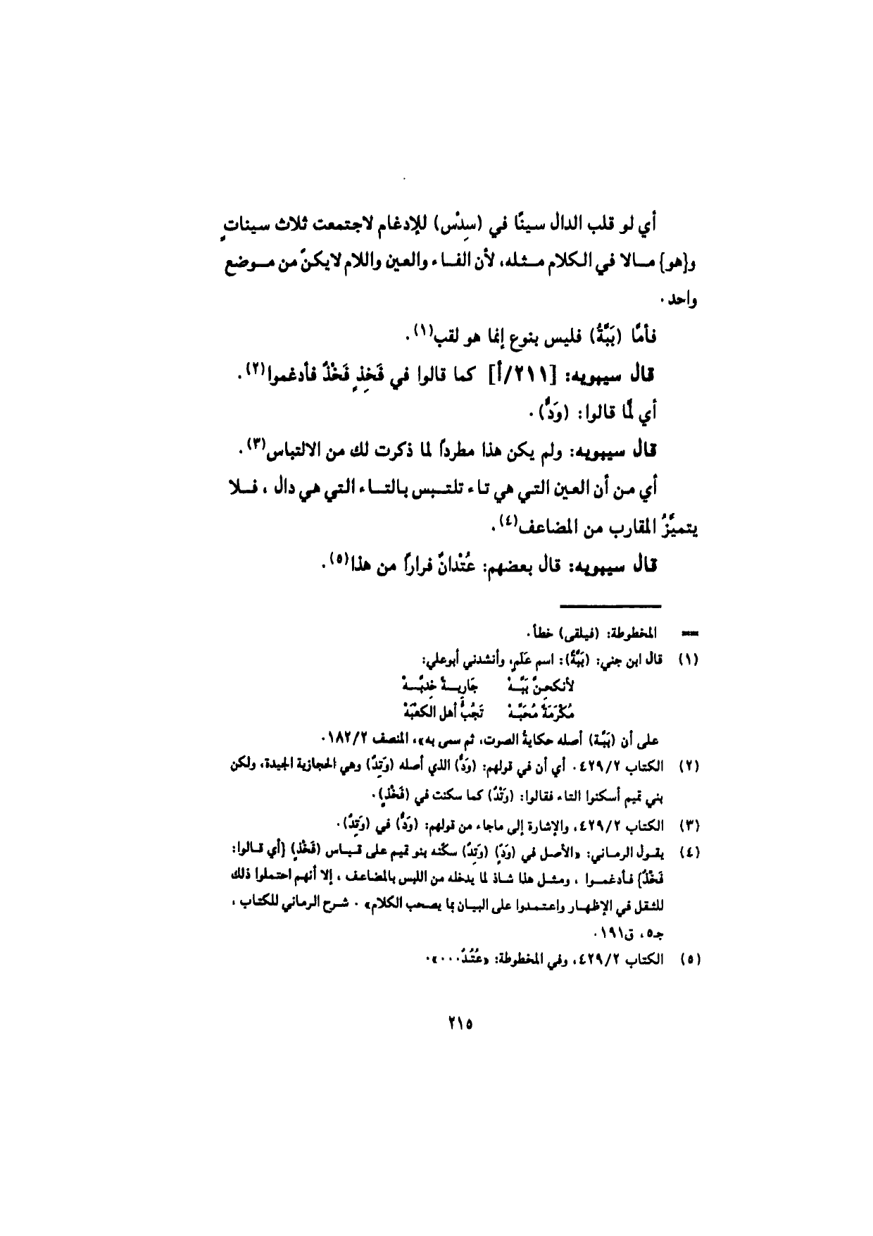 أي لو قلب الدال سينًا في (سِدْس) للإدغام لاجتمعت ثلاث سيناتٍ و {هو} ما لا في الكلام مثله، لأن الفاء والعين واللام لا يكن من موضع واحد.