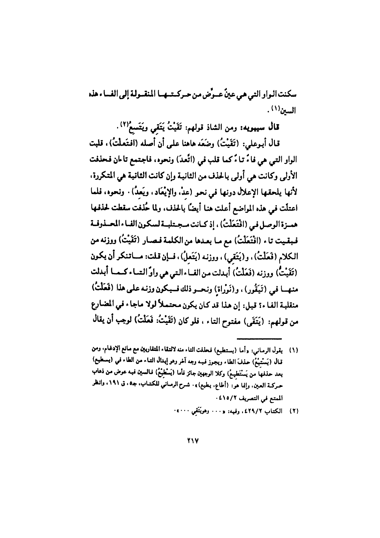 قال سيبويه: ومن الشاذ قولهم: تَقَيْتُ يَتَقِي ويَتَسِعُ.