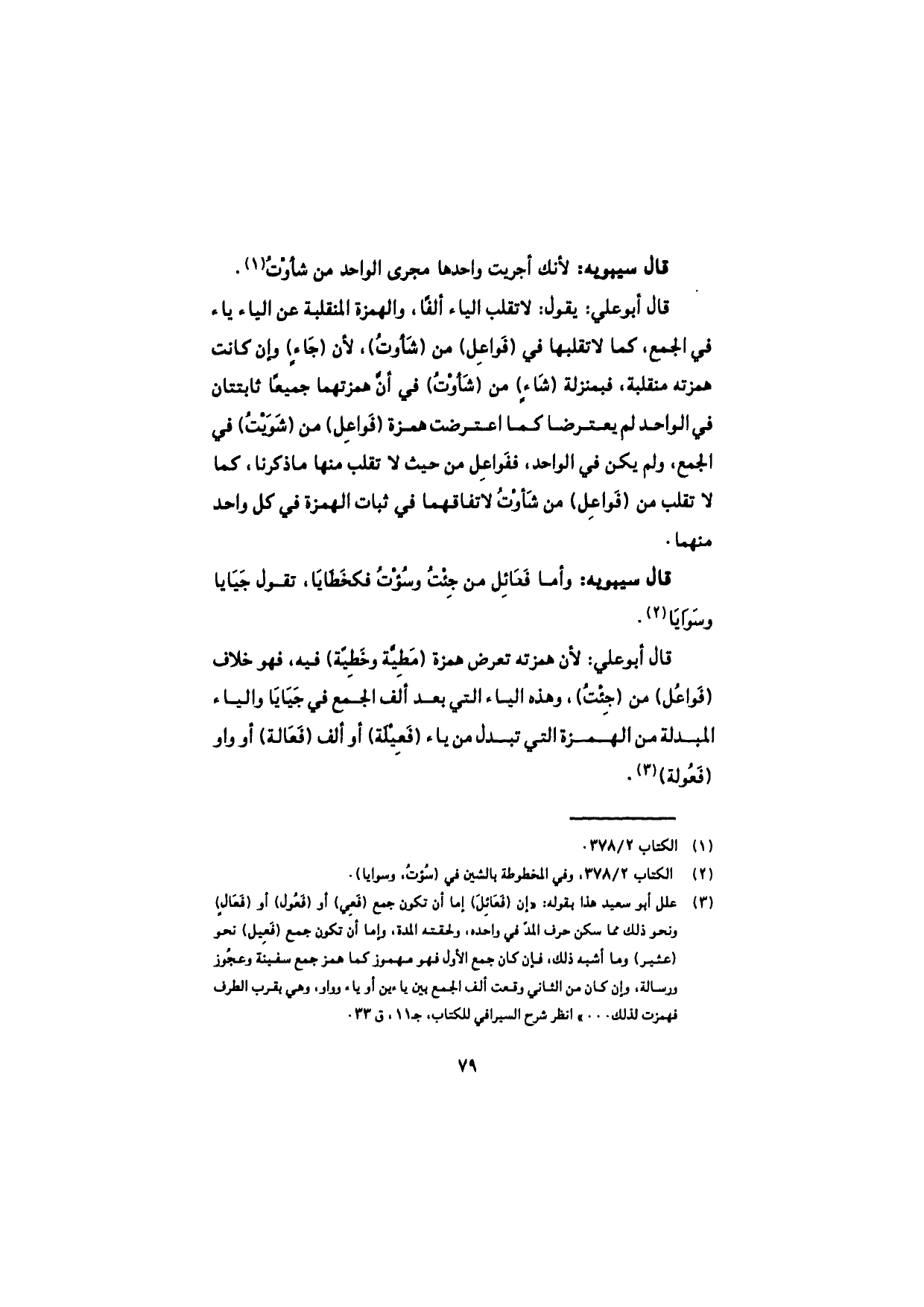 قال أبو علي: يقول: لا تقلب الياء ألفًا، والهمزة المنقلبة عن الياء ياء في الجمع، كما لا تقلبها في (فَواعِل) من (شأوْتُ)، لأن (جاءٍ) وإن كانت همزته منقلبة، فبمنزلة (شاءٍ) من (شأوْتُ) في أنَّ همزتها جميعًا ثابتتان في الواحد لم يعترضا كما اعترضت همزة (فَواعِل) من (شَوَيْتُ) في الجمع، ولم يكن في الواحد، ففَواعِل من حيث لا تقلب منها ما ذكرنا، كما لا تقلب من (فَواعِل) من شأوْتُ لاتفاقهما في ثبات الهمزة في كل واحد منهما.