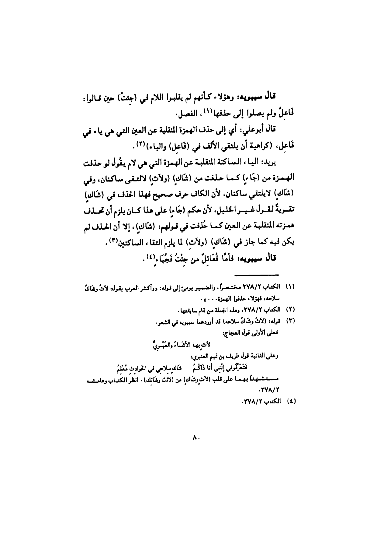 قال سيبويه: وهؤلاء كأنهم لم يقلبوا اللام في (جِئتُ) حين قالوا: فاعِلٌ ولم يصلوا إلى حذفها، الفصل.