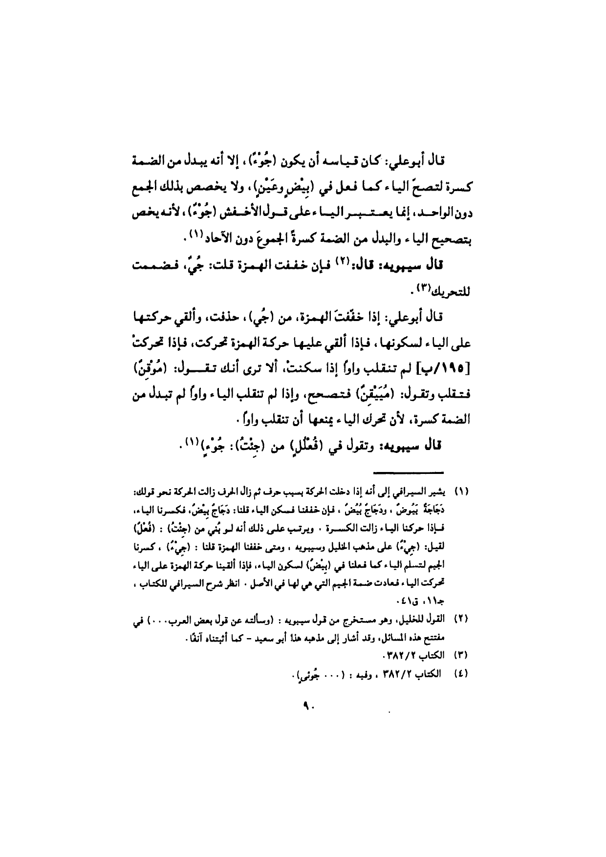 قال أبو علي: إذا خفّفت الهمزة، من (جُي)، حذفت، وألقي حركتها على الياء لسكونها، فإذا ألقي عليها حركة الهمزة تحركت، فإذا تحركتْ [195/ب] لم تنقلب واوًا إذا سكنتْ، ألا ترى أنك تقول: (مُوقِنٌ) فتقلب وتقول: (مُيَيْقِنٌ) فتصحح، وإذا لم تنقلب الياء واوًا لم تبدل من الضمة كسرة، لأن تحرك الياء يمنعها أن تنقلب واوًا.