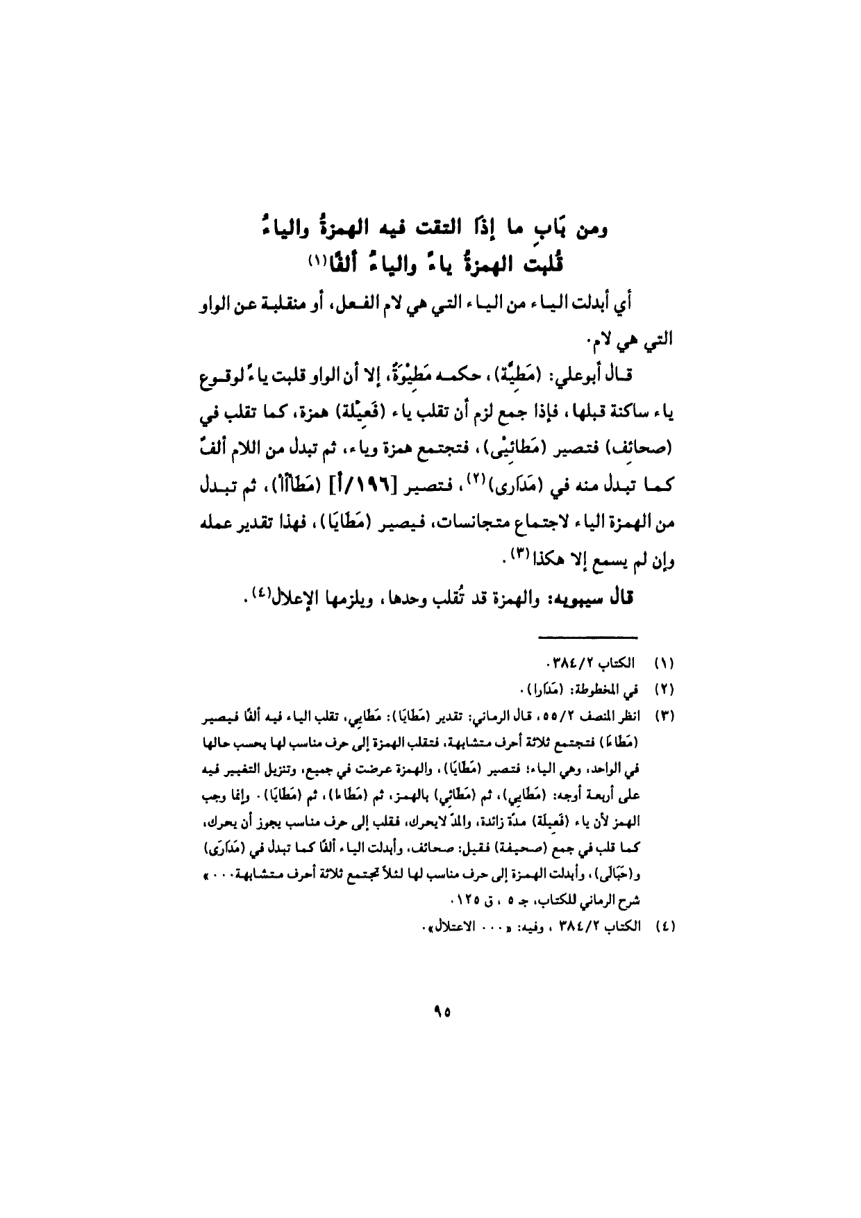 ومن باب ما إذا التقت فيه الهمزةُ والياءُ قُلبت الهمزةُ ياءً والياءُ ألفًا