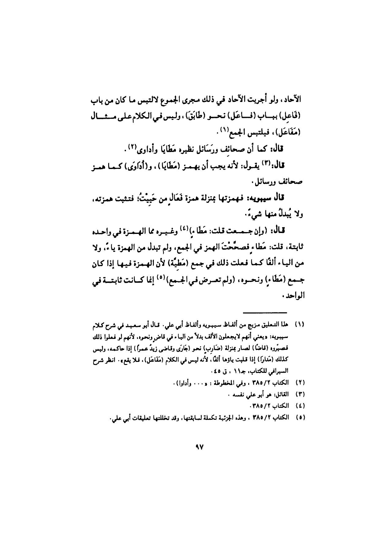 قال: يقول: لأنه يجب أن يهمز (مَطايا)، و (أداوَى) كما همز صحائف ورسائل.