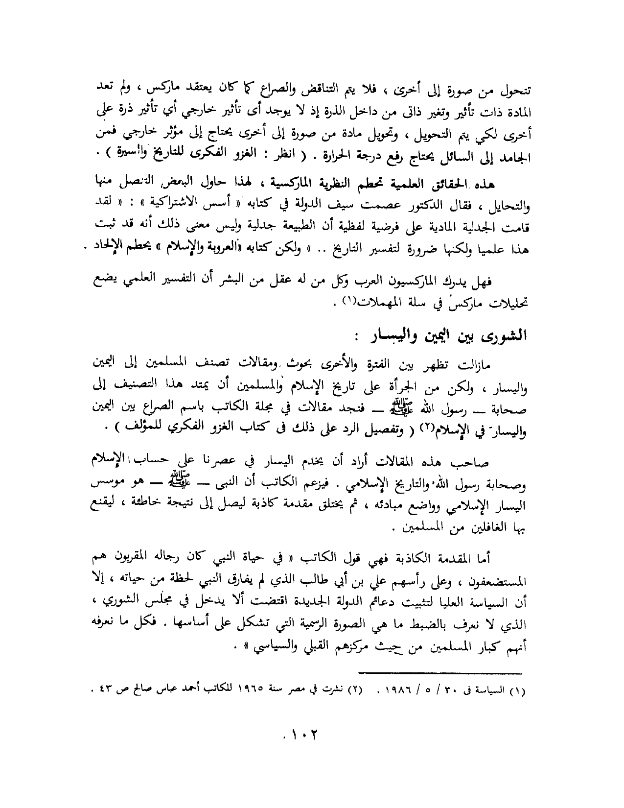 ما زالت تظهر بين الفترة والأخرى بحوث ومقالات تصنف المسلمين إلى اليمين واليسار، ولكن من الجرأة على تاريخ الأسلام والمسلمين أن يمتد هذا التصنيف إلى صحابة - رسول الله - صَلَّى اللهُ عَلَيْهِ وَسَلَّمَ - فنجد مقالات في مجلة " الكاتب " باسم الصراع بين اليمين واليسار في الإسلام (¬2) (وتفصيل الرد على ذلك فى كتاب " الغزو الفكري " للمؤلف).
