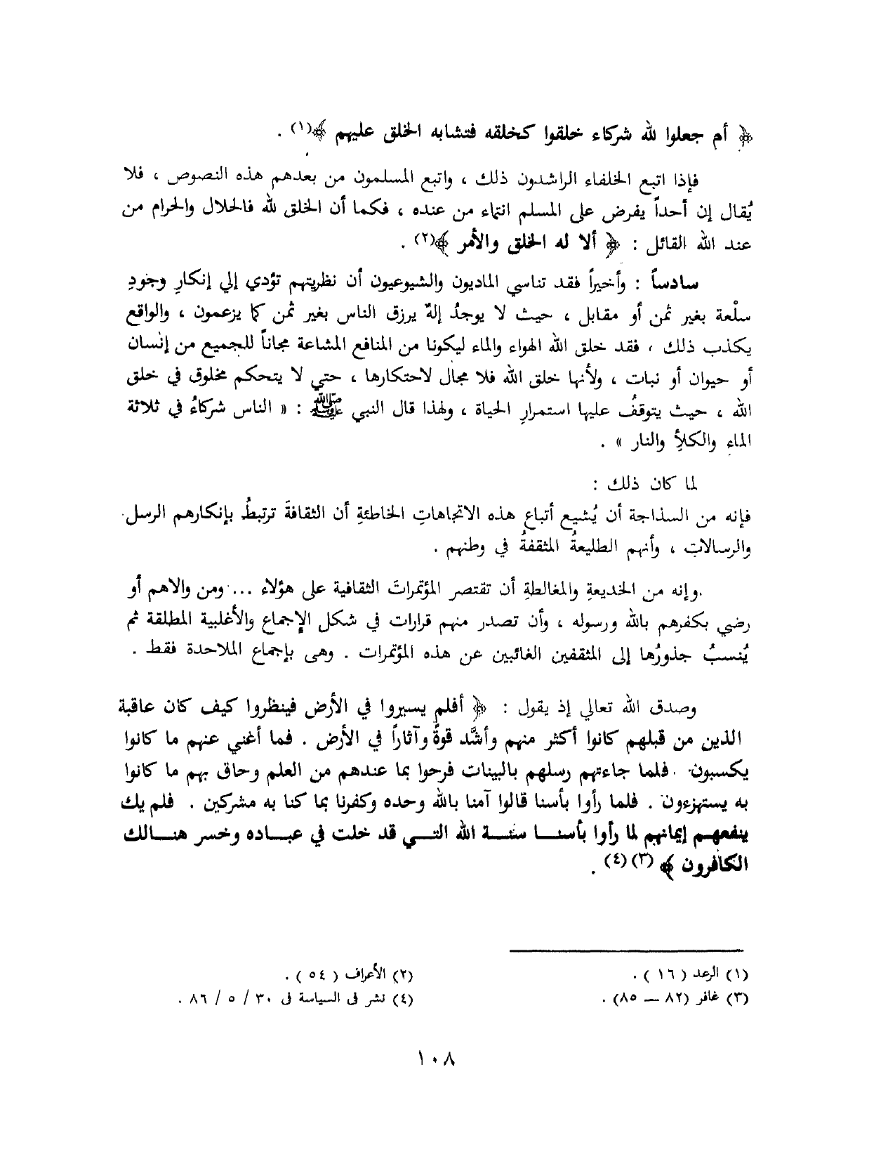 وإنه من الخديعة والمغالطة أن تقتصر المؤتمرات الثقافية على هؤلاء ... ومن والاهم أو رضي بكفرهم بالله ورسوله، وأن تصدر منهم قرارات في شكل الإجماع والأغلبية المطلقة ثم ينسب جذورها إلى المثقفين الغائبين عن هذه المؤتمرات. وهي بإجماع الملاحدة فقط.