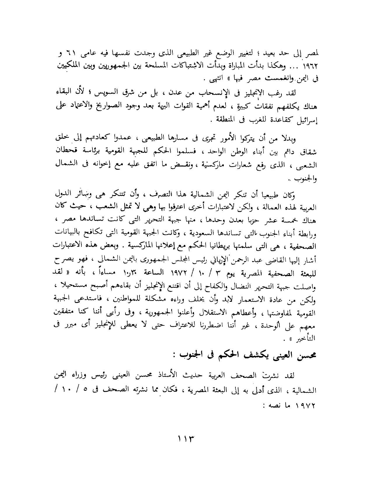 لقد نشرت الصحف العربية حديث الأستاذ محسن العيني رئيس وزراء اليمن الشمالية، الذي أدلى به إلى البعثة المصرية، فكان مما نشرته الصحف في 5/ 10 / 1972 ما نصه: