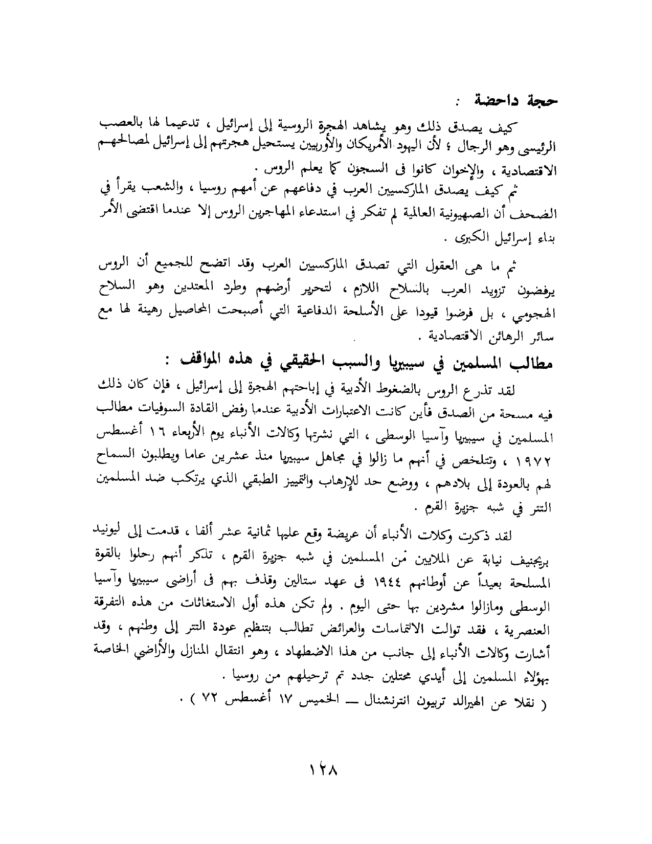 لقد تذرع الروس بالضغوط الأدبية في إباحتهم الهجرة إلى إسرائيل، فإن كان ذلك فيه مسحة من الصدق فأين كانت الاعتبارات الأدبية عندما رفض القادة السوفيات مطالب المسلمين في سيبيريا وآسيا الوسطى، التي نشرتها وكالات الأنباء يوم الأربعاء 16 أغسطس 1972، وتتخلص في أنهم ما زالوا في مجاهل سيبيريا منذ عشرين عامًا ويطلبون السماح لهم بالعودة إلى بلادهم، ووضع حد للإرهاب والتمييز الطبقي الذي يرتكب ضد المسلمين التتر في شبه جزيرة القرم.